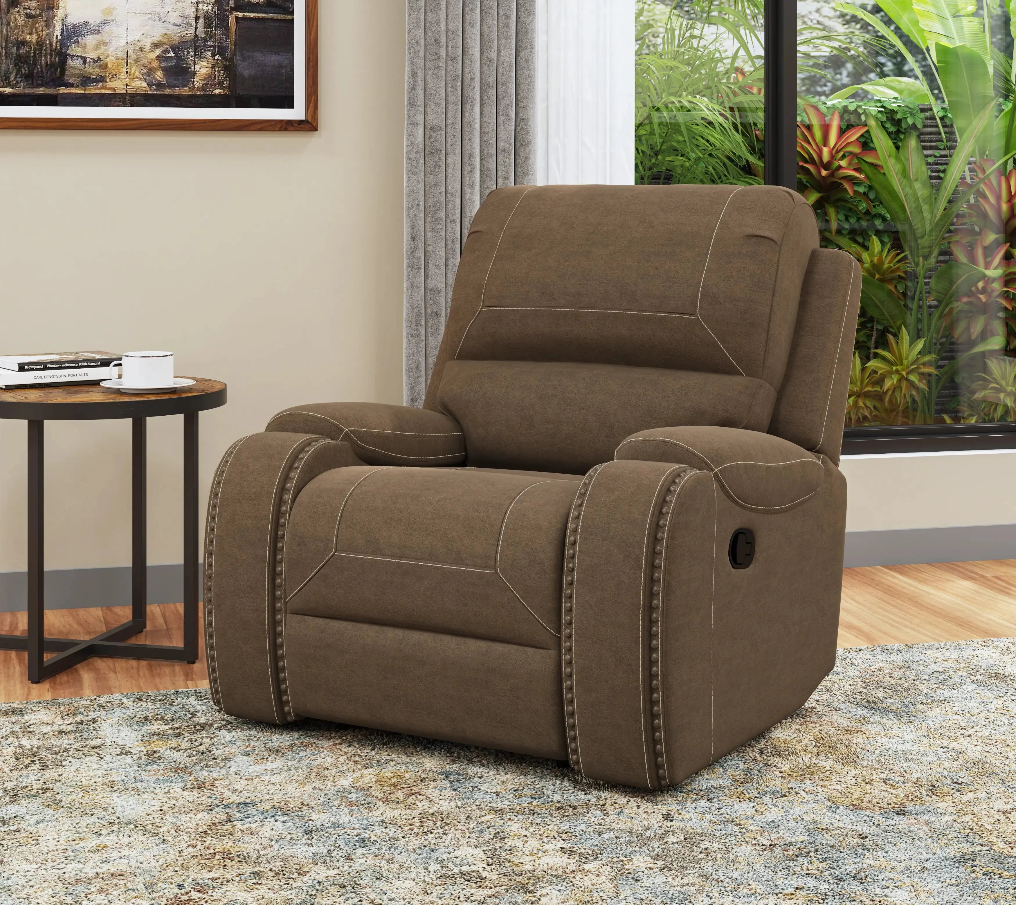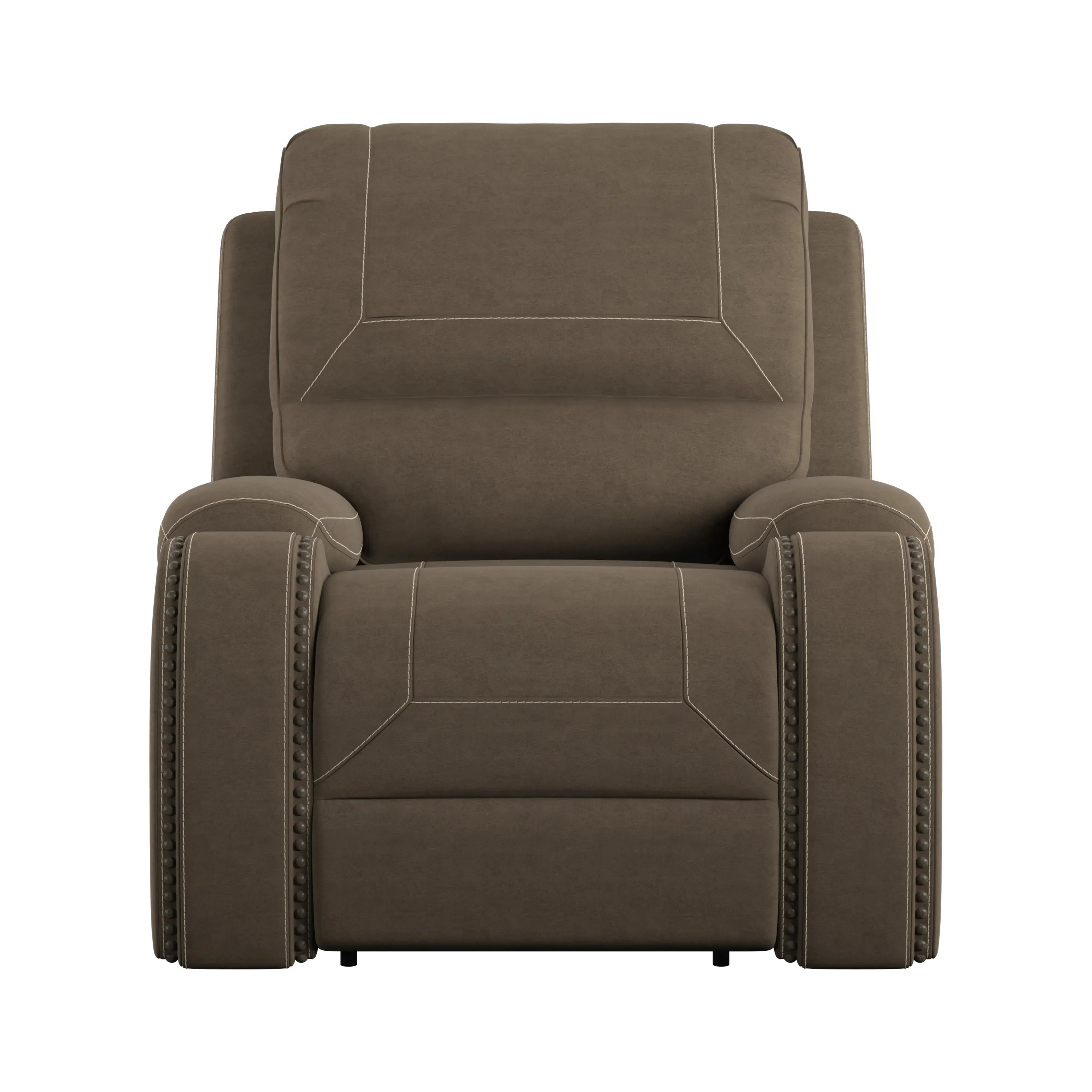 Bring casual comfort into your home with the Adrian motion collection. Soft, walnut brown upholstery is accentuated with contrast stitching, decoratively mitered seams, and copper nail head trim. The thickly pillowed back cushions and padded arms just beg you to recline into their embrace with the easy release of a lever while cupholders and USB charging ports assure you won't need to leave any time soon.