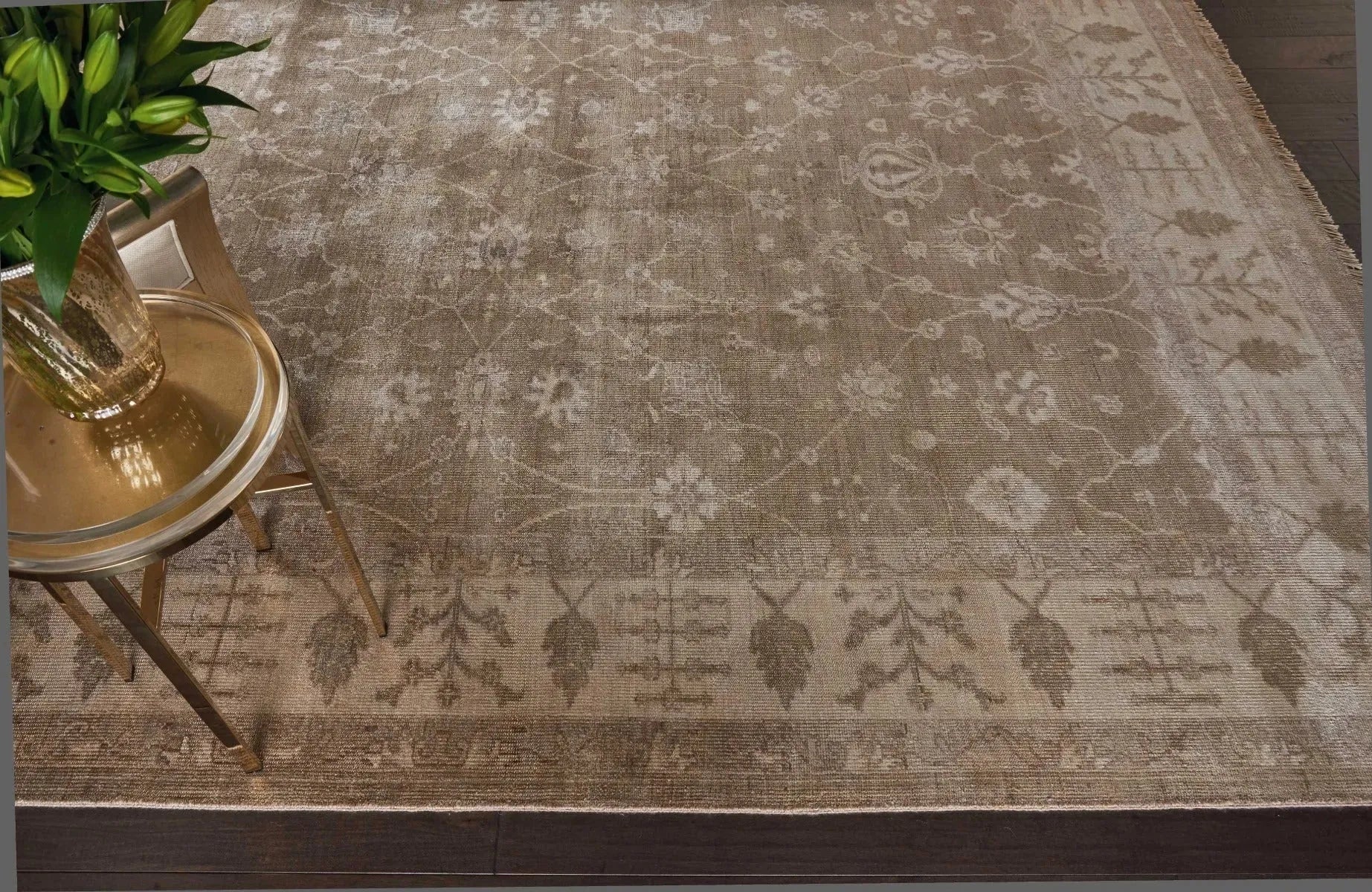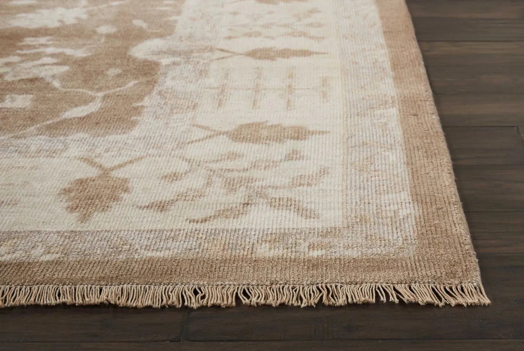 Evoking the history and intricacies of traditional Persian designs, this antique-inspired collection is hand knotted from luxurious bamboo extruded silk-like fibers for an extravagant texture and tone that exudes a spectacular sumptuousness. Featuring an array of elegant color palettes in blended rich tones. In a majestic color palette of ivory, chocolate brown and rose, a traditional bordered leaf and vine design truly shines. Woven from a lush bamboo extruded silk-like pile, this radiant rug, is remarkable to look at and wonderful to touch.