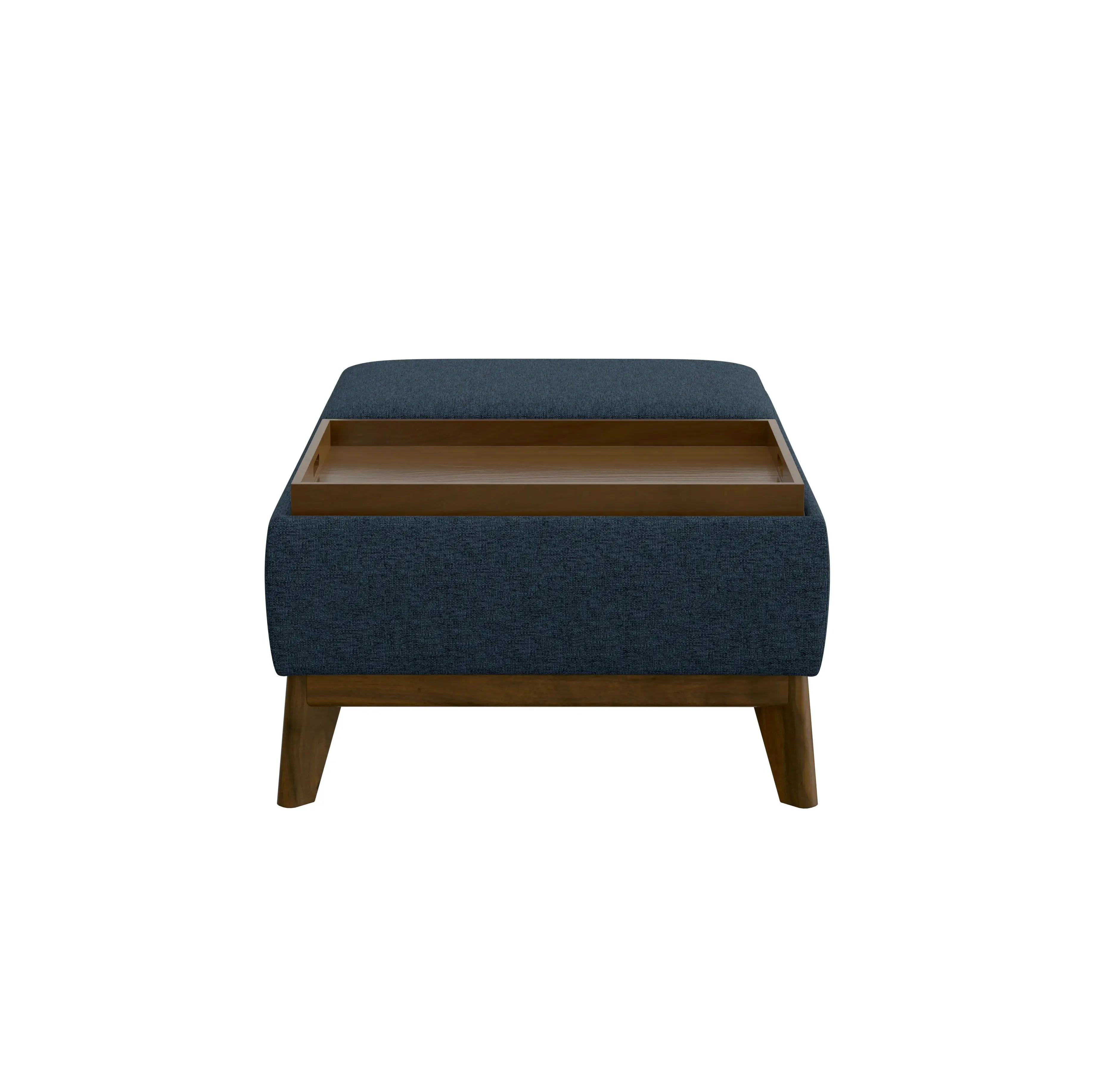 Bringing mid-century to the modern age, the Aria collection is sure to add character to your space. Wrapped in a classic navy fabric, each piece sits atop a rich, walnut-toned exposed solid wood frame. Slightly flared legs and prominent welting add to the sophisticated look. Hidden storage in the perfectly sized rectangular ottoman puts blankets, games, and more at your fingertips. Equipped with a split top that reverses to wood trays, Aria is ready to help you entertain or enjoy a quiet evening alone.