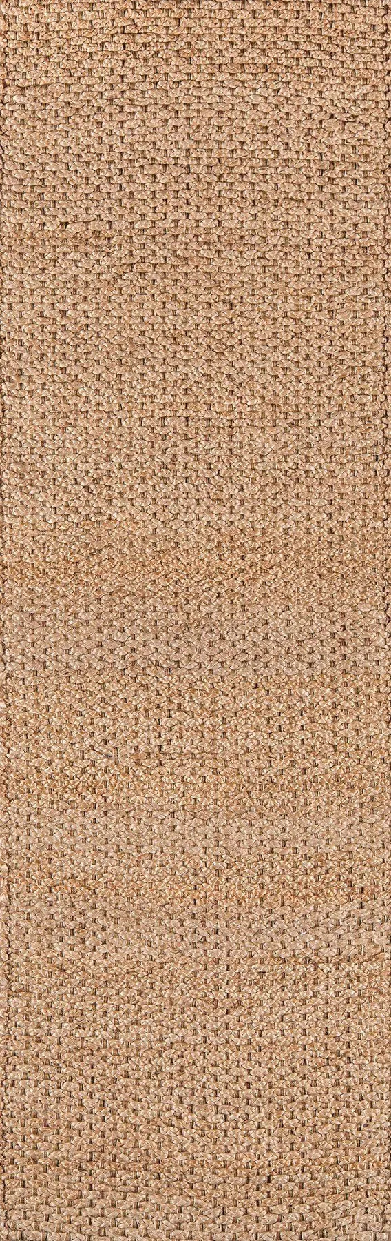 Global accents meet contemporary design aesthetic in the exquisite craftsmanship of this modern rug. Natural tone-on-tone beige shades enhance the intricate woven pattern that fills the solid field of the rug with organic texture. Handmade from 100% natural jute fibers, this eco-friendly floorcovering feels good underfoot and holds up in high-traffic areas of the home.