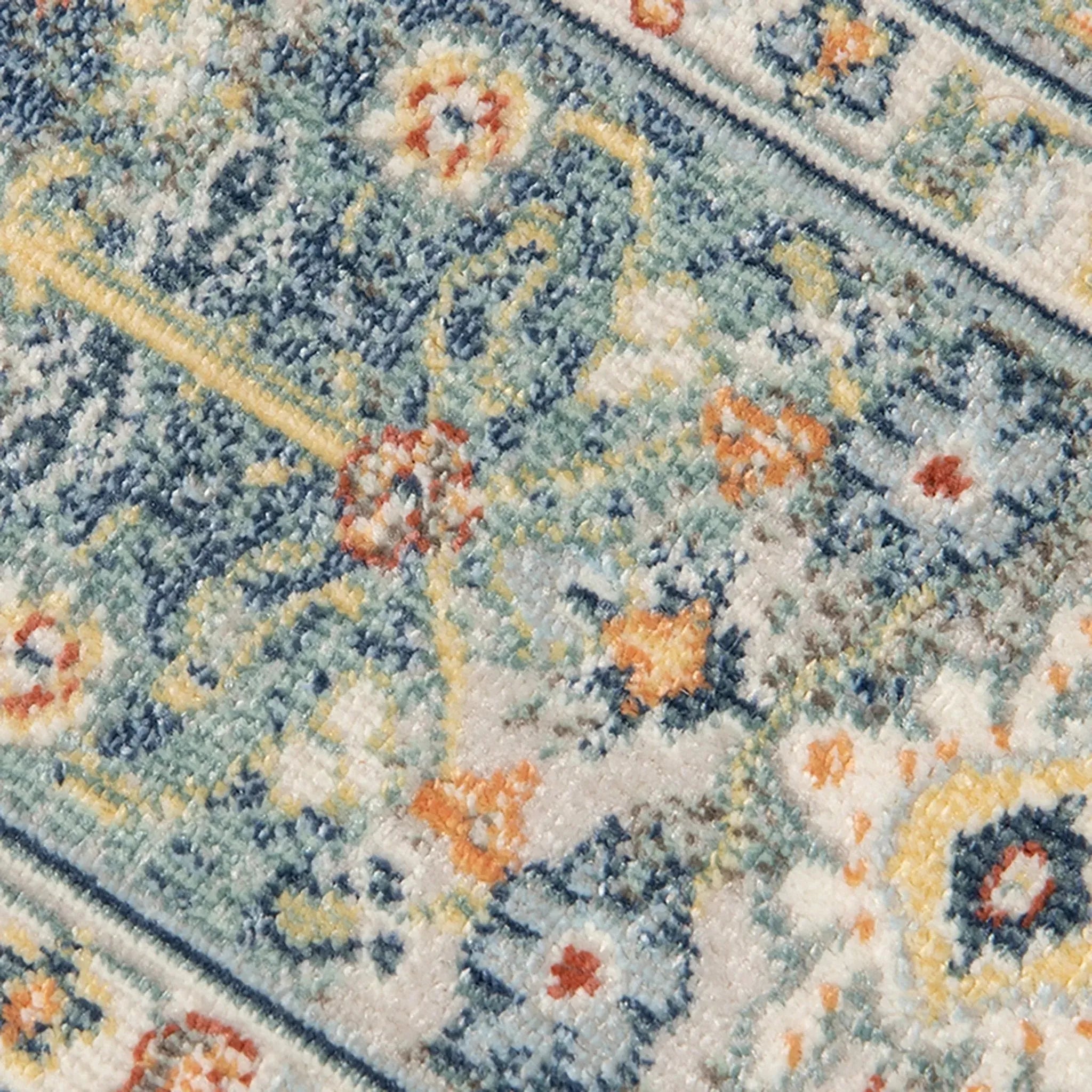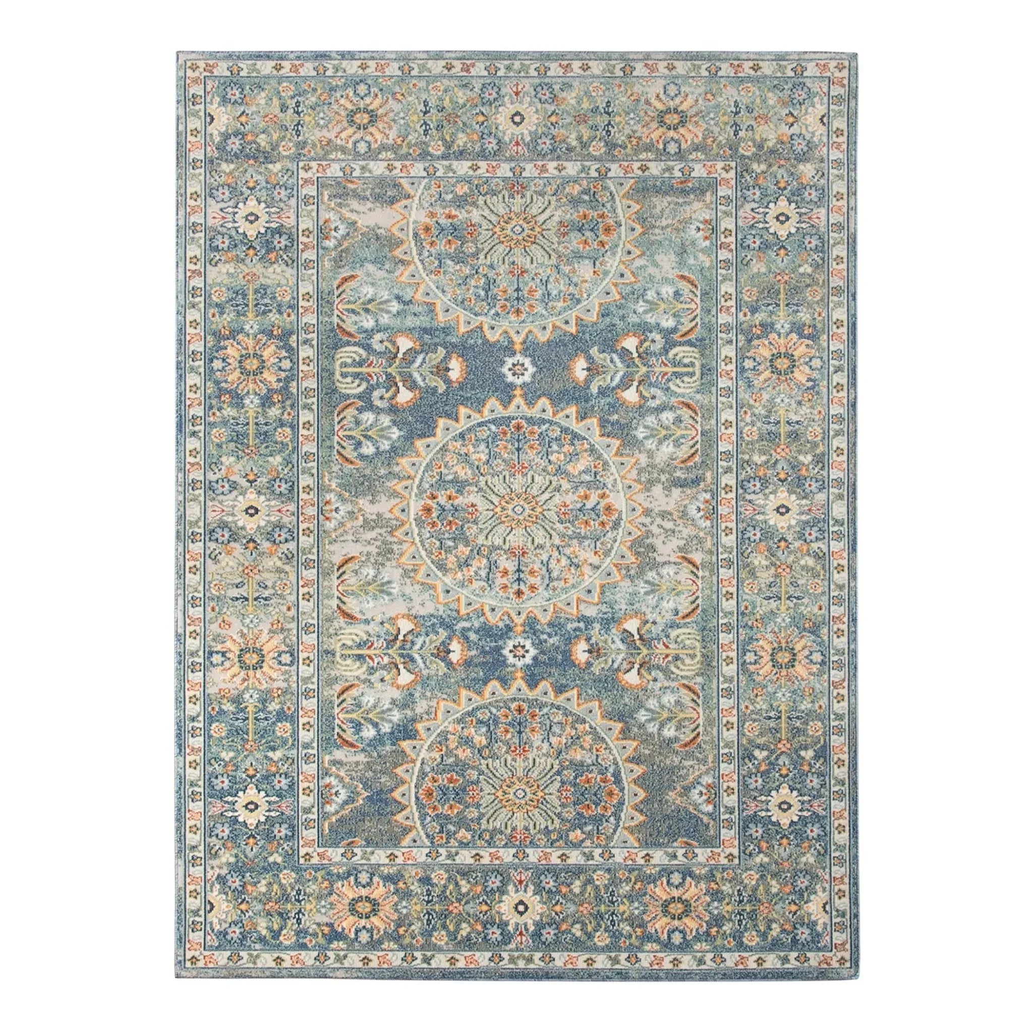 The Parisa PSA06 Denim/Multi Rug comes in various sizes, including 2x10, 5x7, 8x10, 8x11, 9x13, and 12x15 feet, accommodating different room dimensions.
