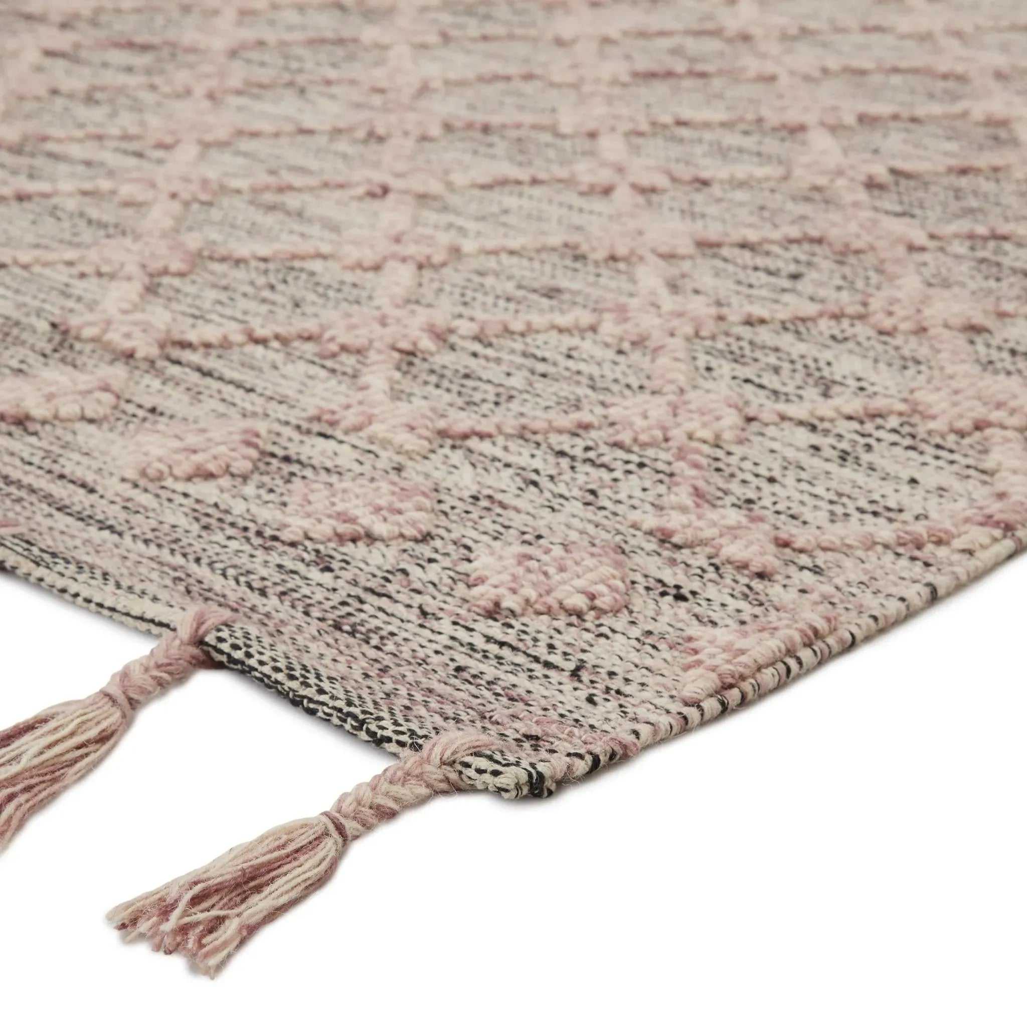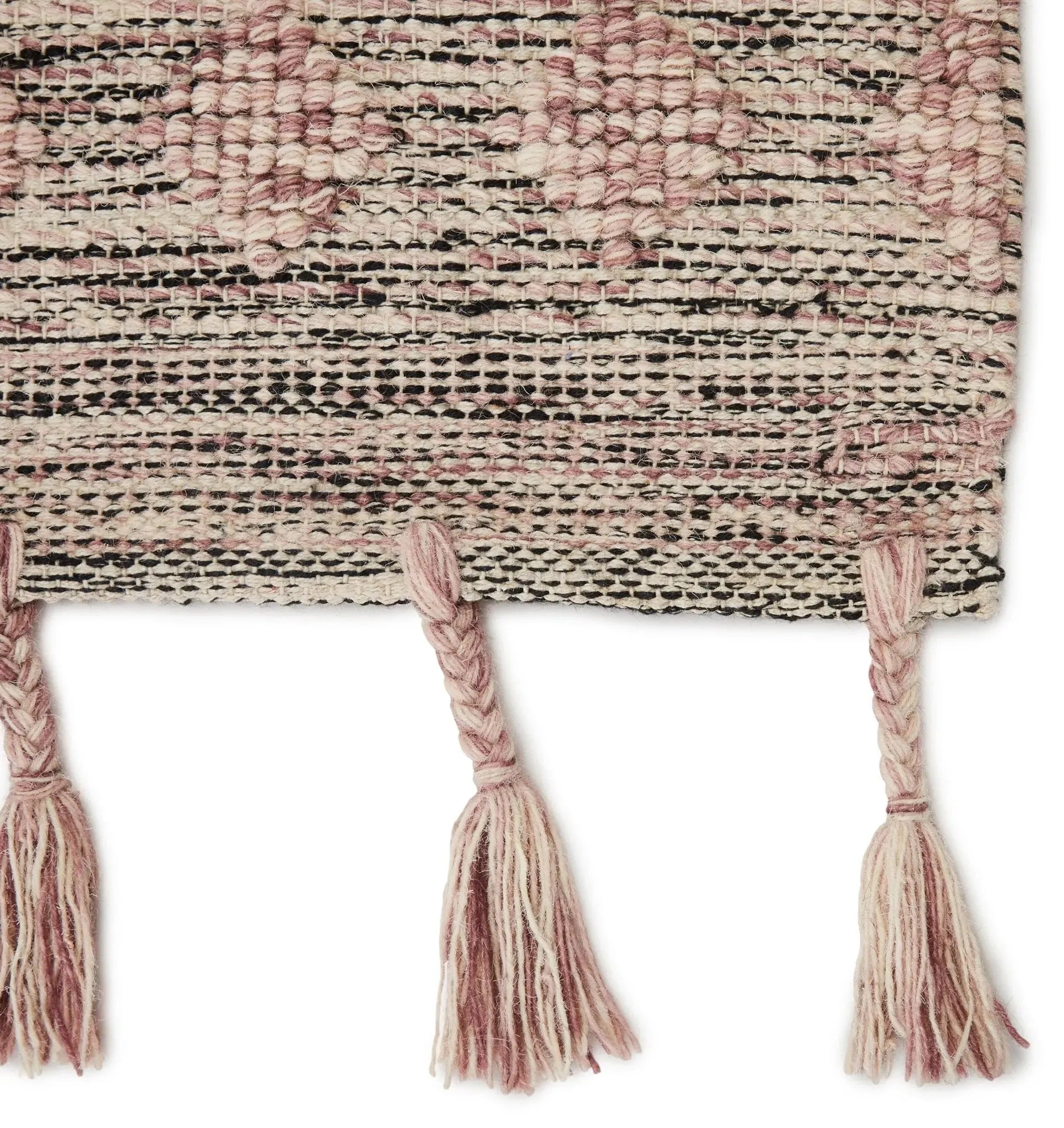 The casual and contemporary Calixta collection boasts an assortment of flatweave designs made of hand-carded wool that lend both texture and comfort to any room. The Madrona rug features a dusty pink colorway with interwoven yarns of black and cream for added dimension and depth. The raised boucle lattice motif and braided fringe details lend a global vibe to this handcrafted rug.