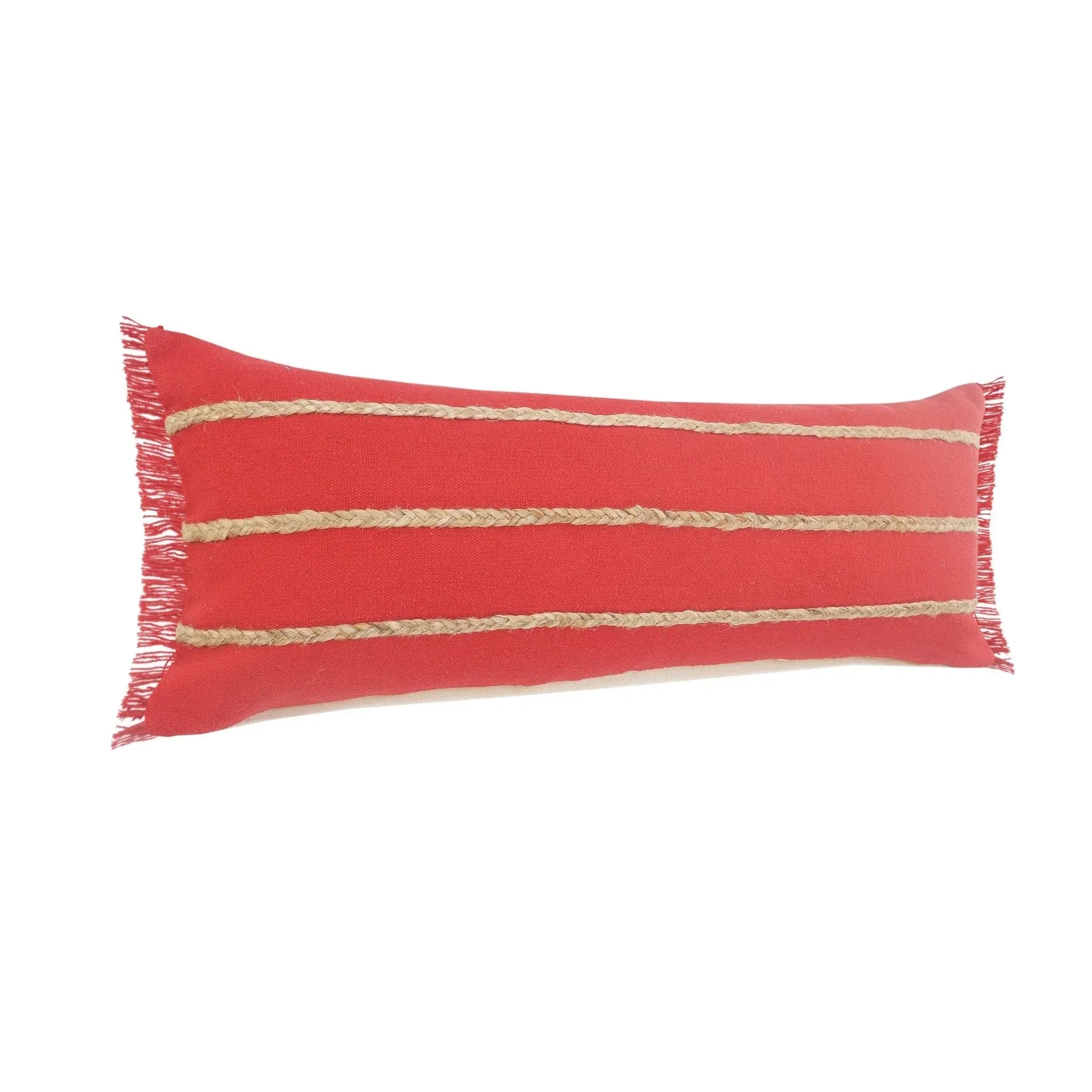 Designed to thrill, our pillow collection will add intricate mastery and eye pleasing designs to any room. This addition dwells perfectly on a comfy couch, bed, or bench. This pillow is a wonderful accent for the nautical or Americana home looking to add an elevated classic to their collection. This piece features a well-toned solid background, textured jute braiding, and bordered fringe for additional flare. Handcrafted with the customer in mind, there is no compromise of comfort and style with the pillow line we create.