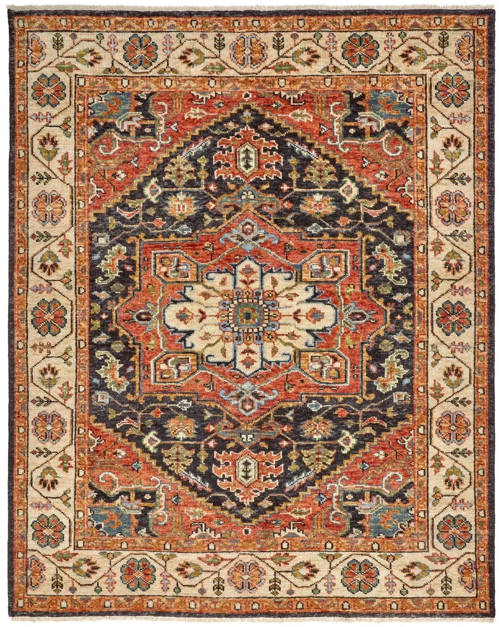 Traditional Oushak designs come to life in the Carrington Collection. Hand knotted in pure wool, utilizing the age-old techniques of natural hand dying, each design offers varying degrees of color saturation in warm and cool tones throughout, creating visual depth with classic border motifs in updated traditional colors.