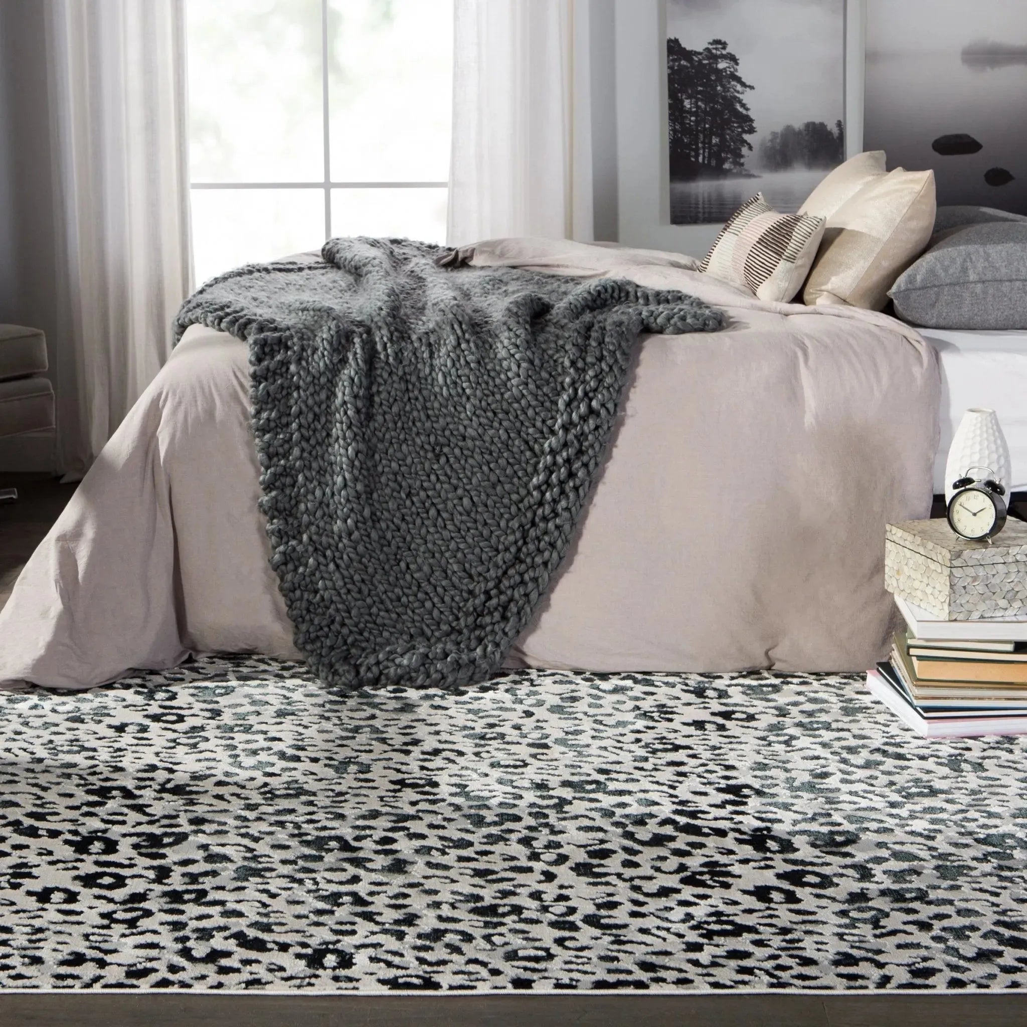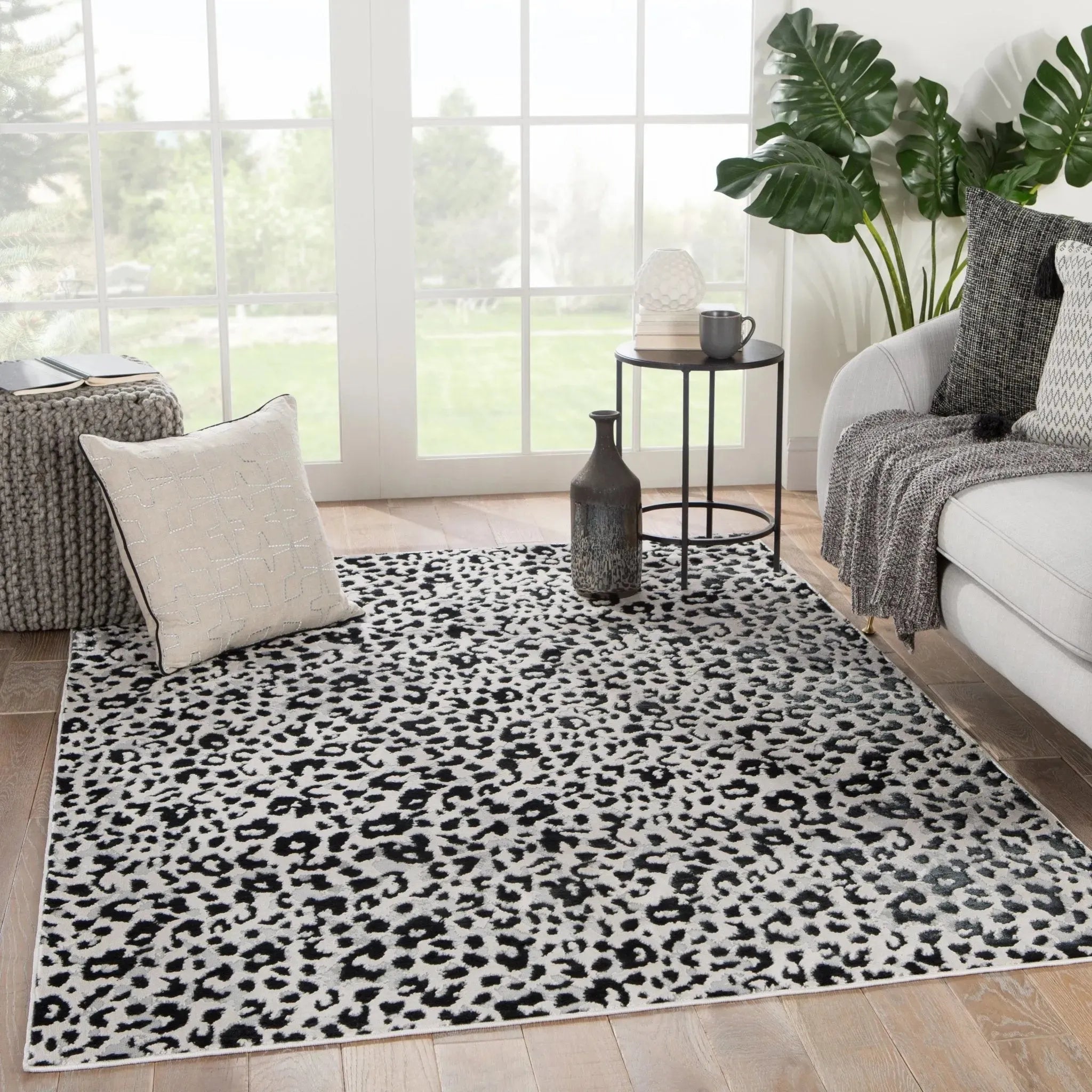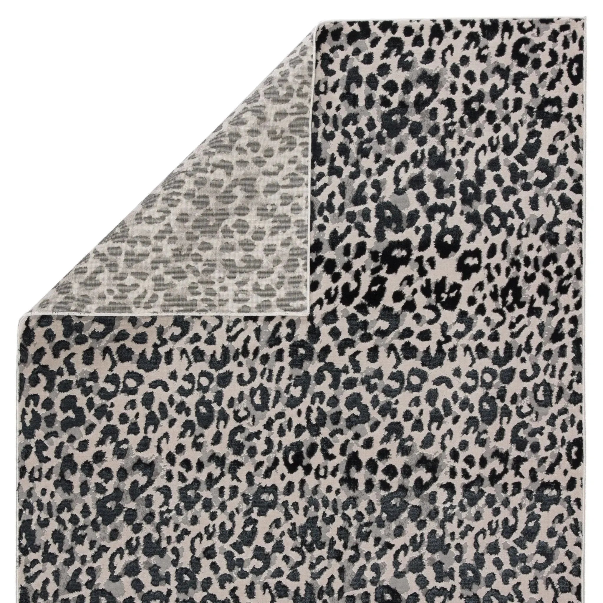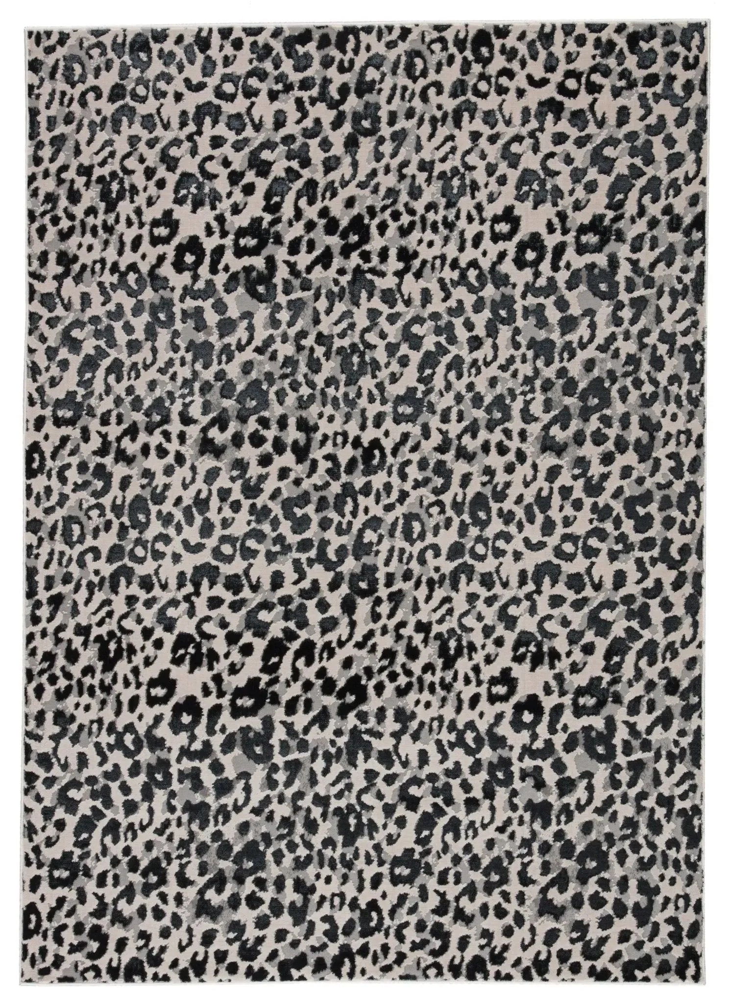 The show-stopping yet surprisingly versatile appeal of the Catalyst collection brings contemporary edge to any home. The silver, gray, and black Fauve rug's wild, spotted animal print is familiar and chic, perfect for adding texture and intrigue to a room. This machine-made rug features metallic polyester fibers blended with stain-resistant polypropylene for a brilliant sheen from various perspectives.