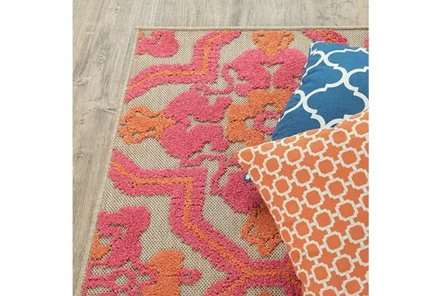 The indoor/outdoor Cayman collection features crisp geometric and globally-inspired patterns in vibrant shades that pop against a sand-colored background. Machine woven of 100% polypropylene in a flatweave construction with a high/low textured pile that works well both inside the home and outdoors. This rug is perfect for your living room, dining room, den, bedroom, or any living space.