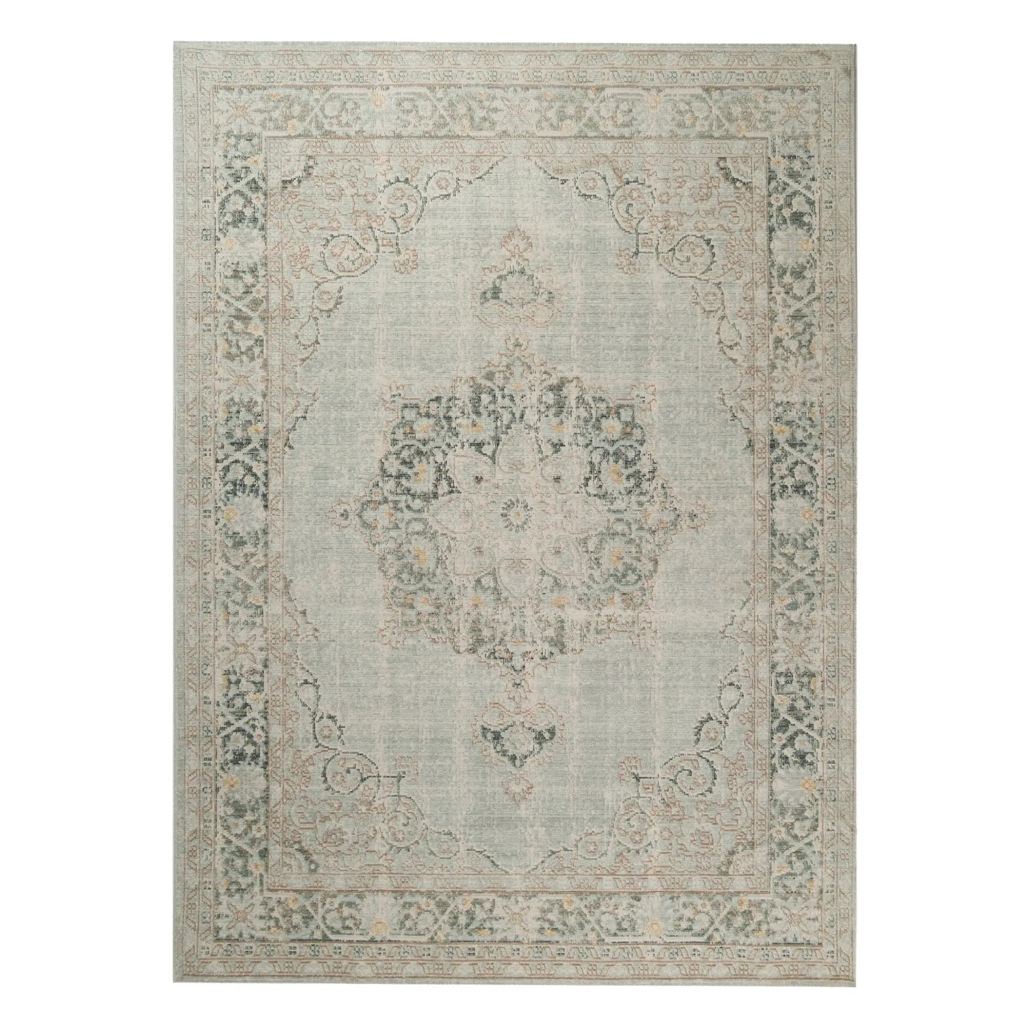 If you're looking for a classic and timeless designer rug, you're in the right place. Flaunting a refreshing color palette, this area rug is versatile enough to easily fit into any space in your home. Featuring a vintage, weathered look and a super low pile, you'll love both its design and craftsmanship. Power-loomed in Turkey with 100% polyester yarn, this rug is as durable as it is beautiful.