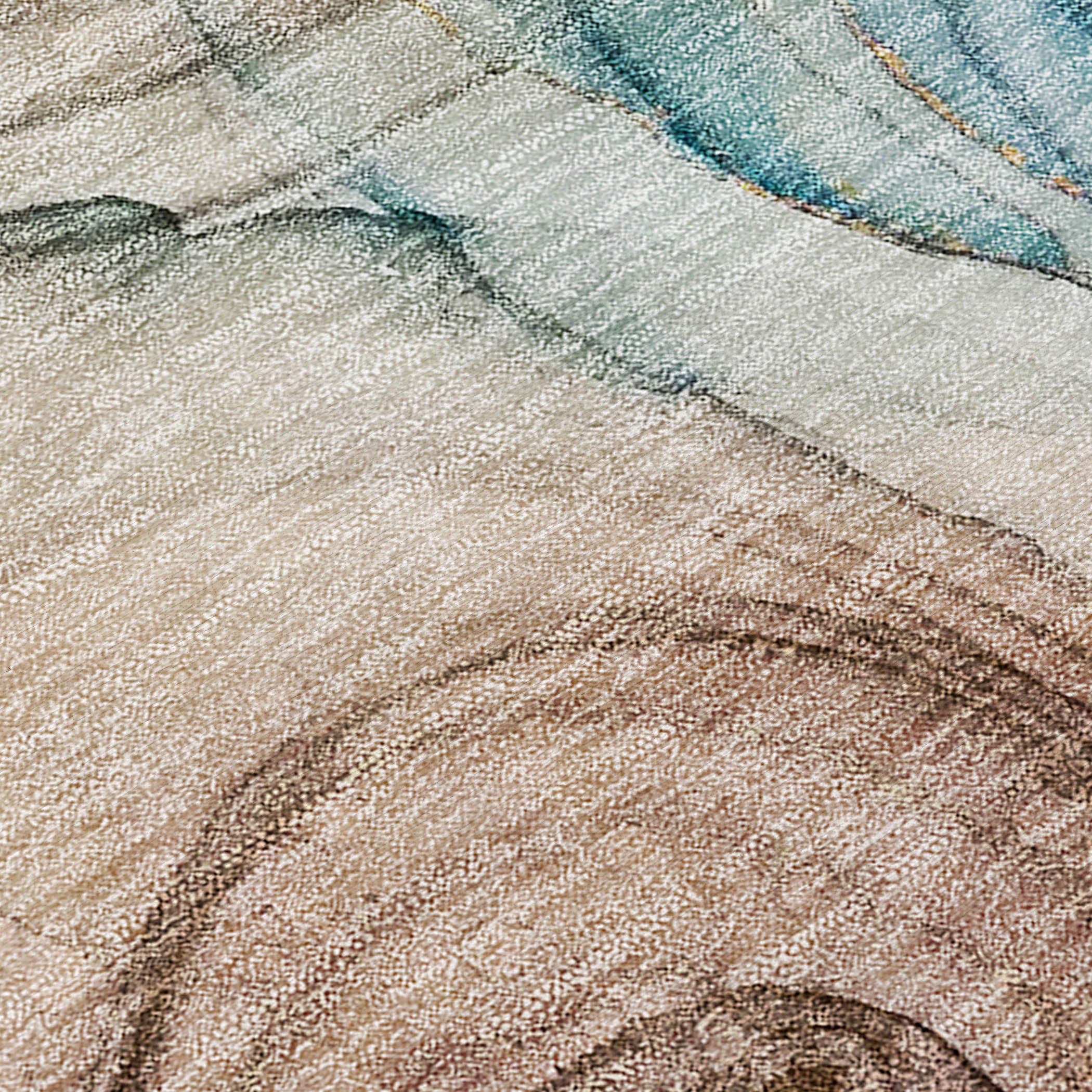 Experience the serene beauty of our transitional area rug, featuring soft organic shapes that create a modern flared pattern. Ideal for indoor or outdoor use, this UV stabilized rug is designed with an ultra-thin construction and a built-in non-skid backing, eliminating the need for a separate rug pad. It's machine-washable and family and pet-friendly, providing convenience alongside style.