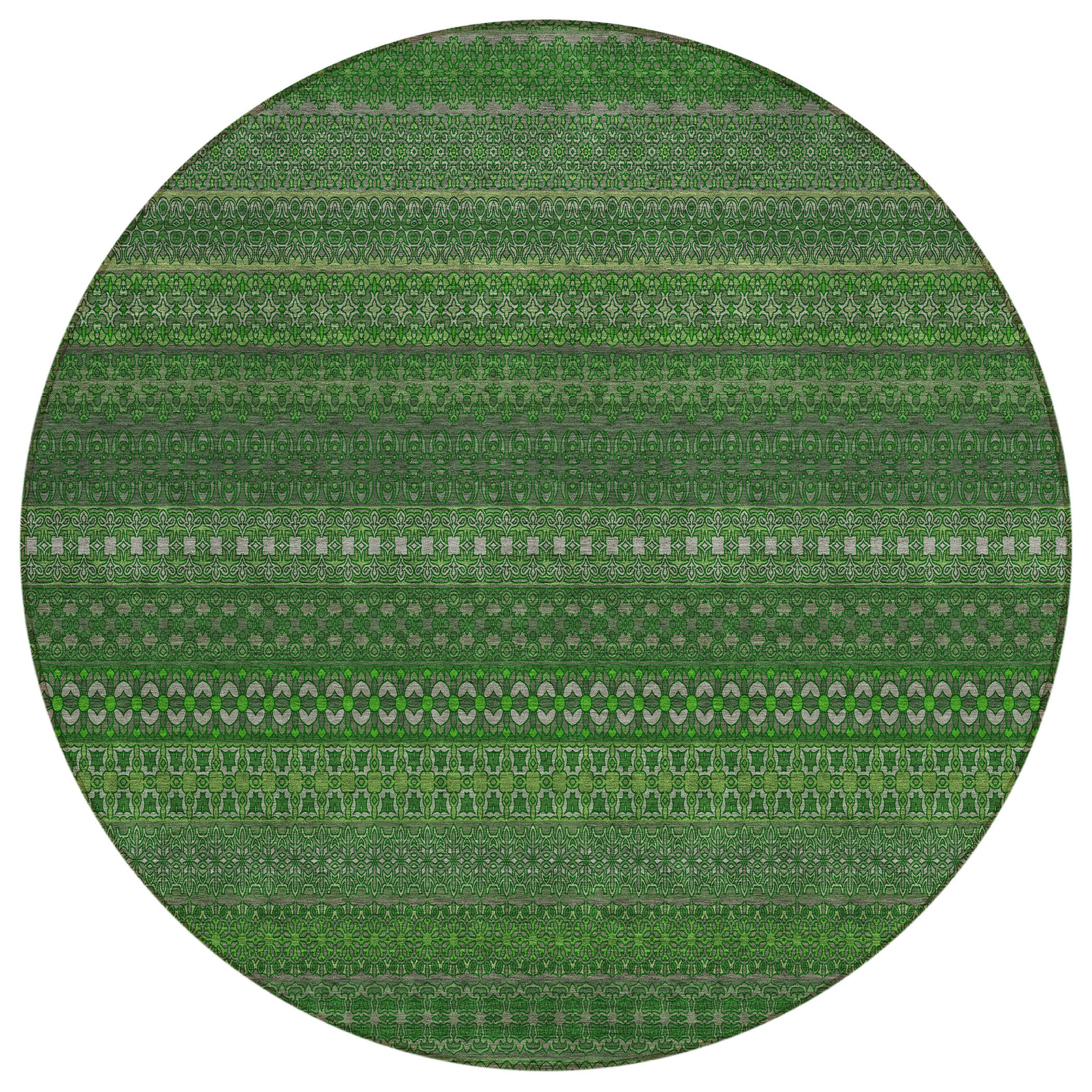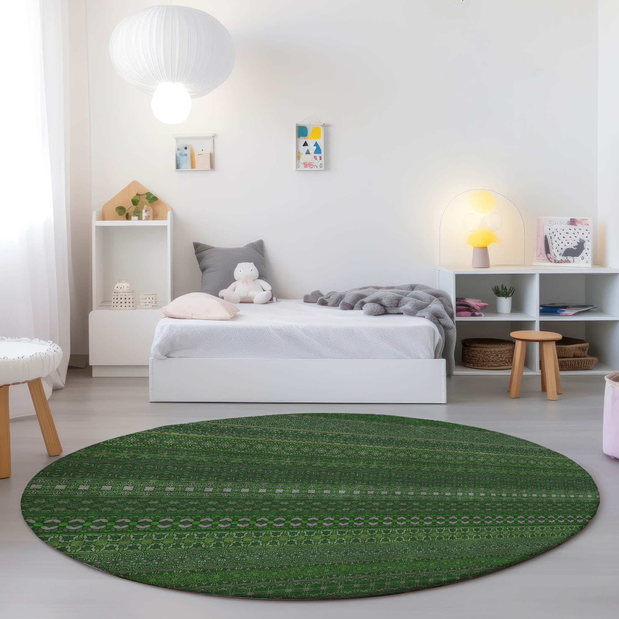 Step into a world of whimsy with our area rug, featuring an eclectic mix of shapes and motifs that add a touch of playfulness to your floor. This transitional striped rug is a true statement piece. With UV stabilization, it can be confidently placed indoors or outdoors. The ultra-thin construction includes an incorporated non-skid backing, ensuring stability and removing the need for a separate rug pad. It's machine-washable and designed to withstand the demands of a family-friendly home.