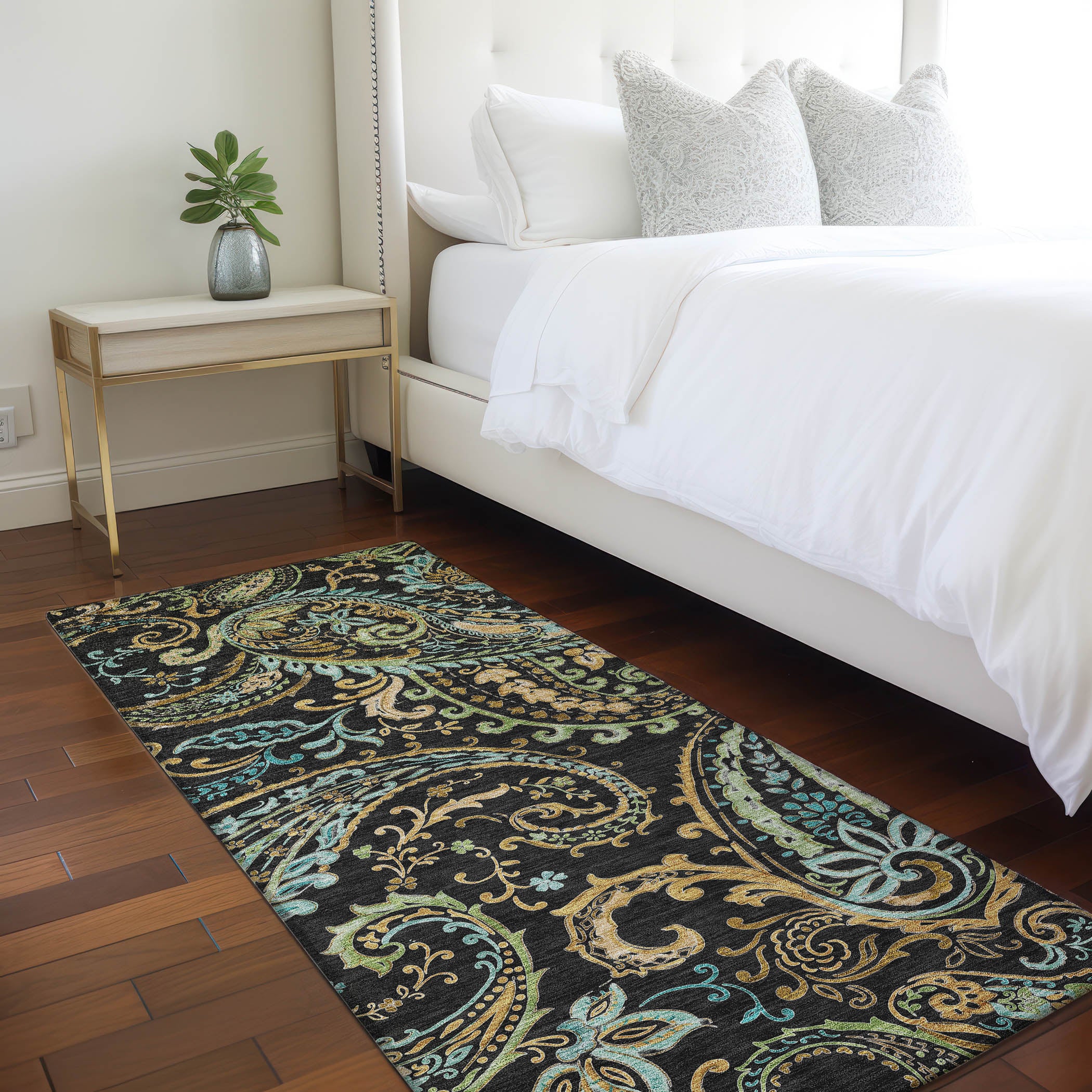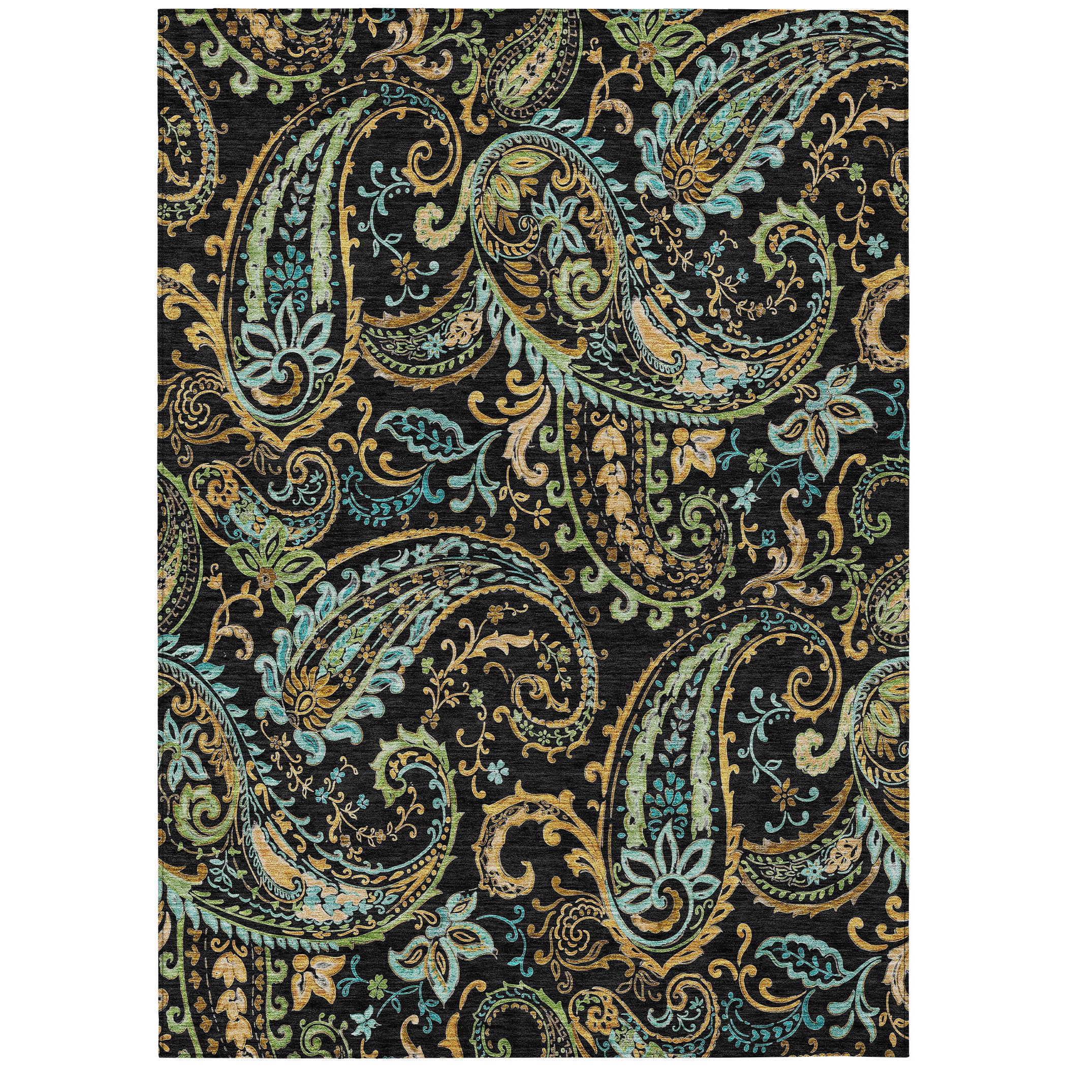 Upgrade your decor with our area rug featuring intricate teardrop shapes, adding a versatile design element that enhances any space. This transitional paisley rug effortlessly elevates your home, infusing it with a touch of timeless elegance and charm. But it's not just about aesthetics – this rug offers practical benefits too. UV stabilized for indoor or outdoor use, its colors remain vibrant and fade-resistant. The ultra-thin construction with an incorporated non-skid backing eliminates the need for a separate rug pad, providing stability and safety. Plus, it's machine-washable, making it easy to keep clean. Designed to be family and pet-friendly, this rug is built to withstand the demands of everyday life.