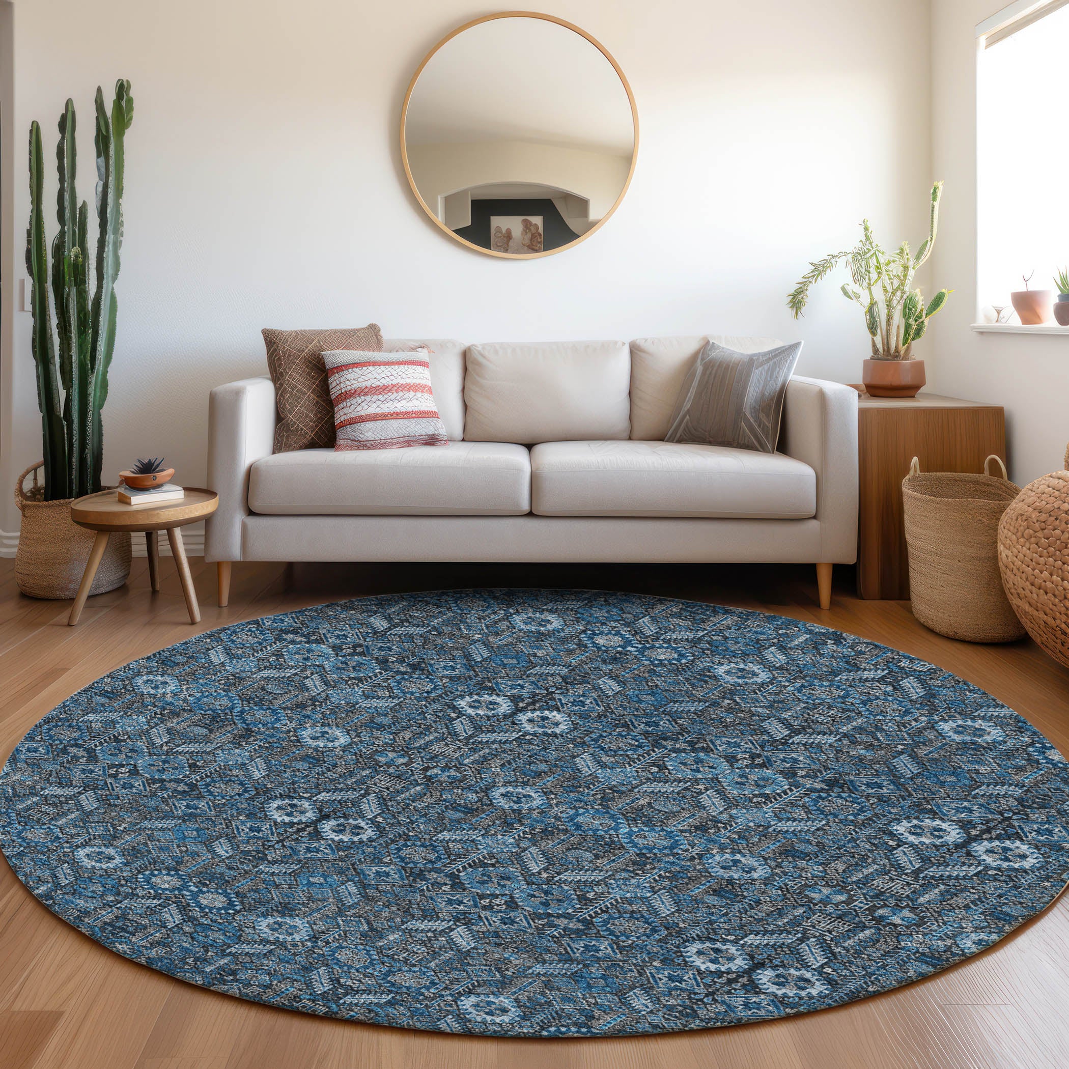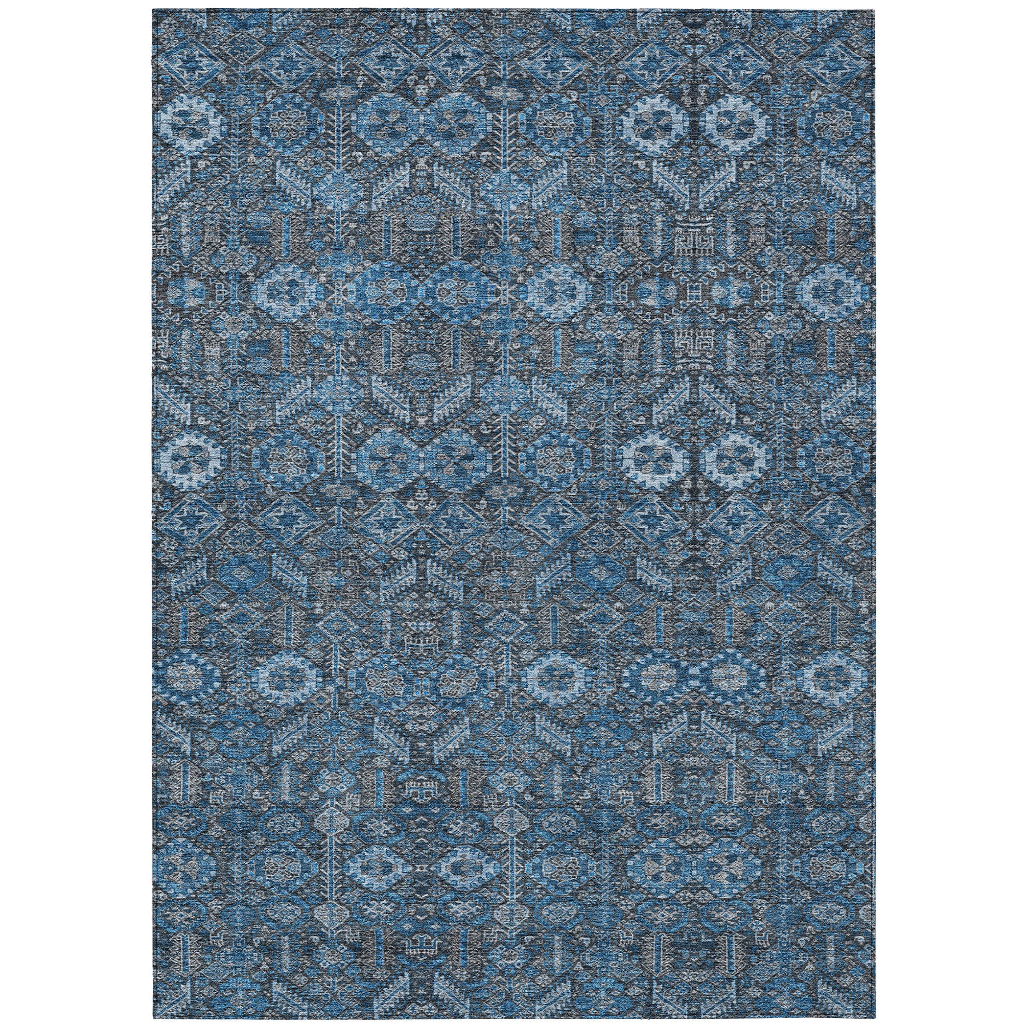 Indulge in our area rug's Bohemian inspired motifs, portraying unique shapes for a hip visual. This transitional, bohemian design ensures your décor stays fashion-forward. UV stabilized for indoor and outdoor use, this rug features ultra-thin construction with an incorporated non-skid backing, rendering a separate rug pad unnecessary. It offers easy-care with it's machine-washability, making it very family and pet-friendly.