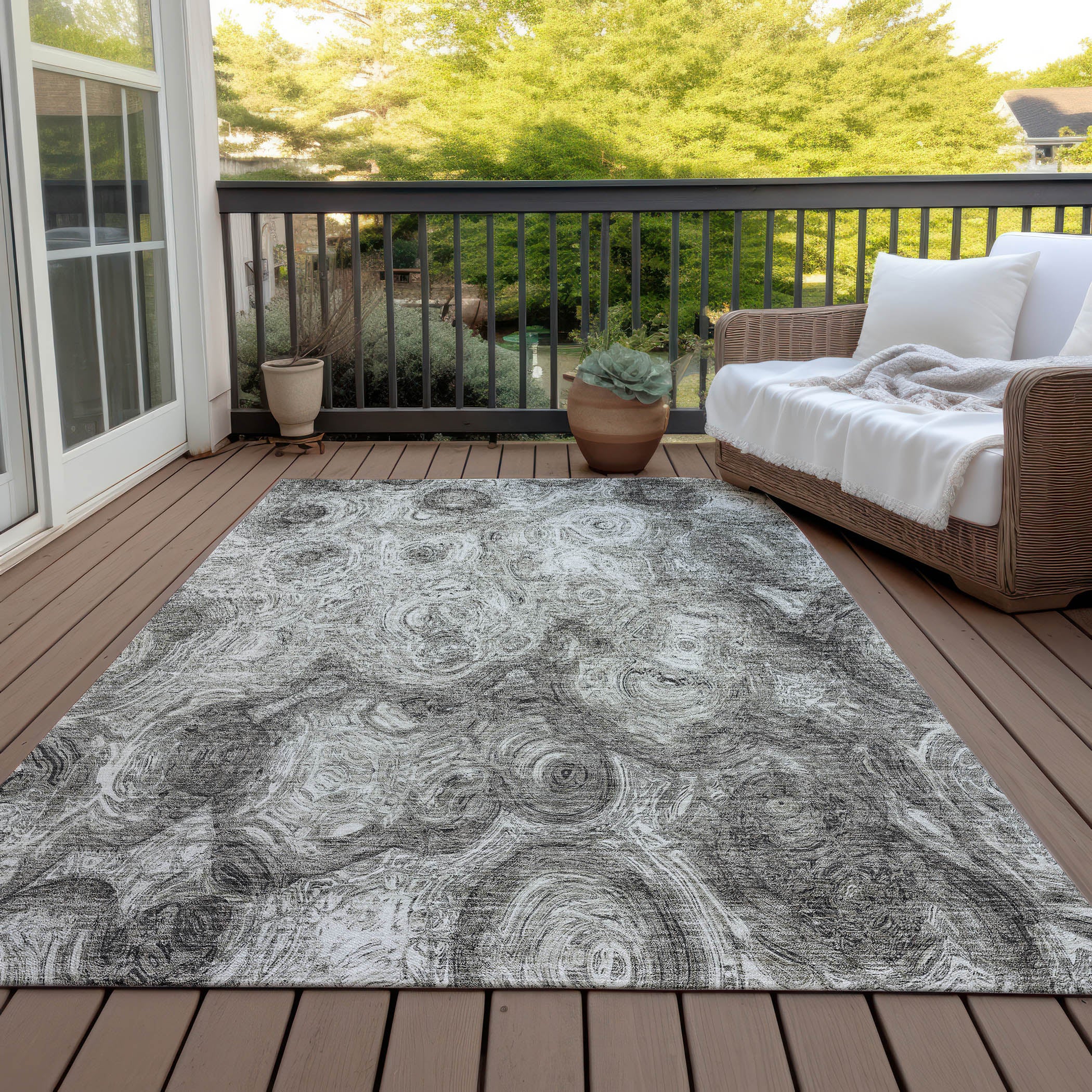 Step into a world of artistic elegance with our area rug, where organic circles create a sense of fluidity and movement. Perfect for transitional spaces, this rug offers a stunning blend of modern and traditional design elements. UV-stabilized to withstand both the indoors and the great outdoors, this rug is a versatile addition to any home. The ultra-thin construction includes a built-in non-skid backing, saving you the cost and hassle of a separate rug pad. Plus, it's machine-washable and perfect for families and pets—practical luxury at its finest.