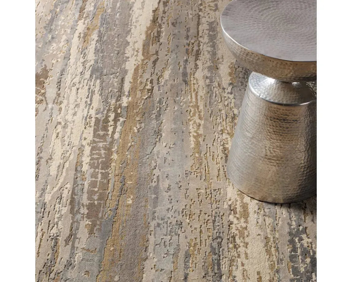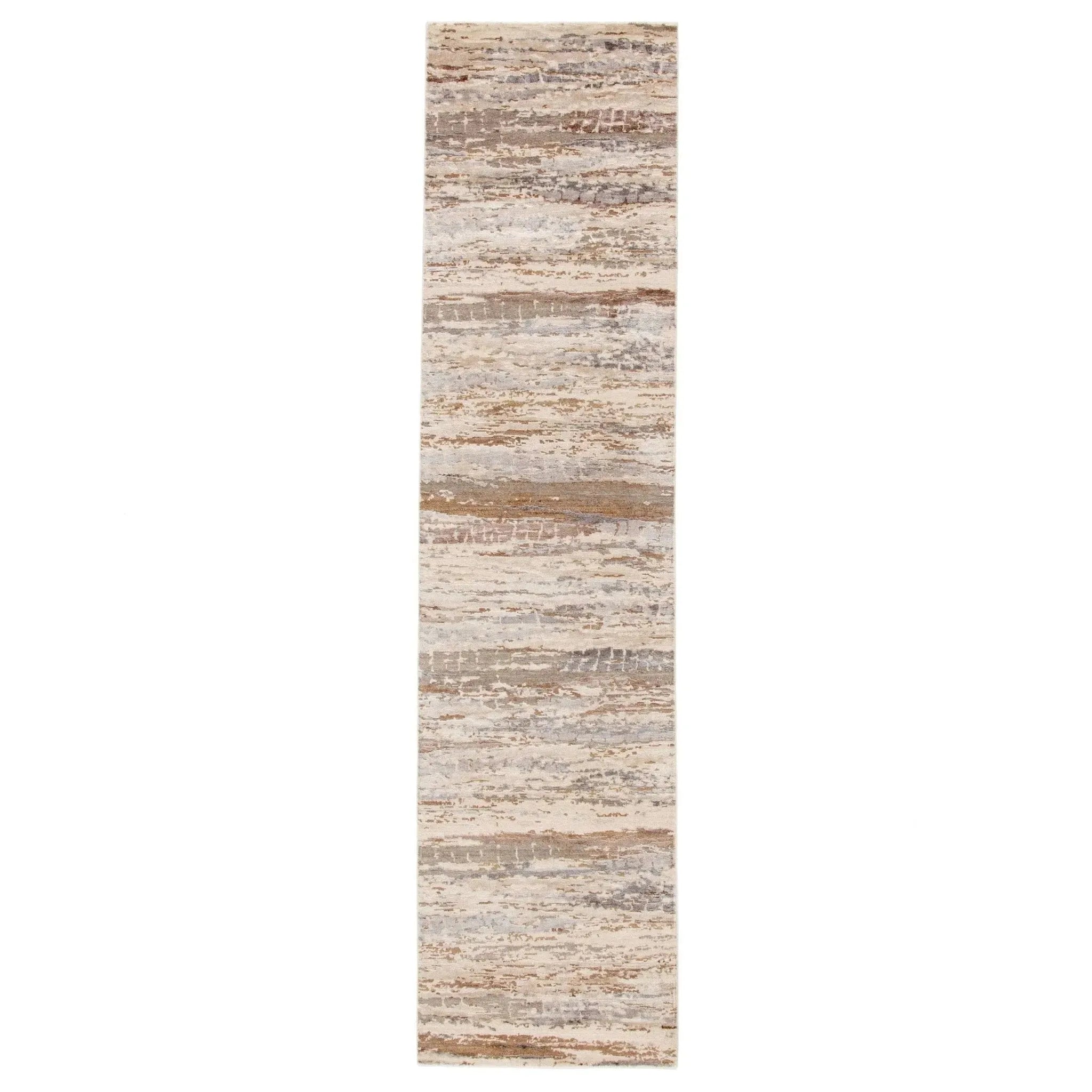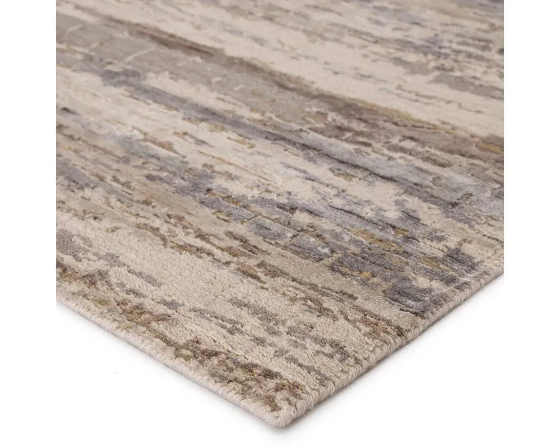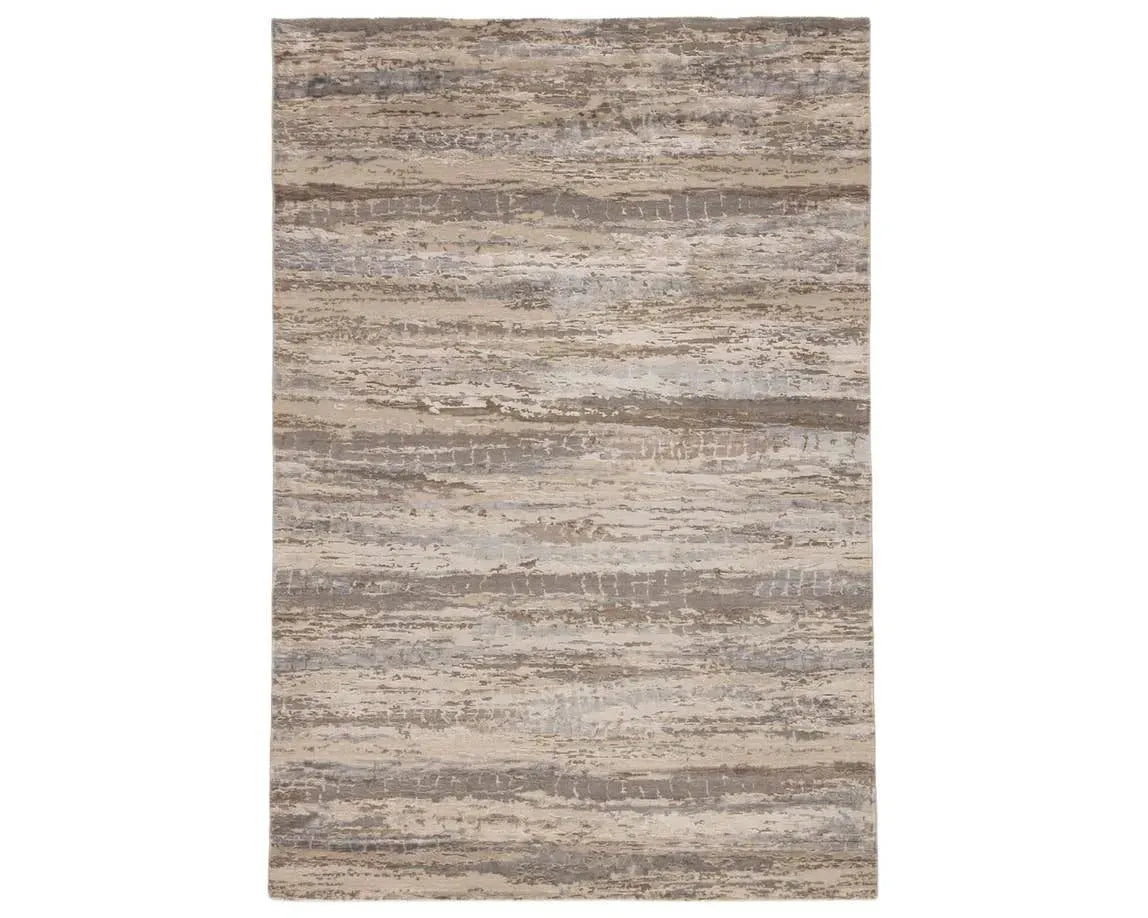 Hand-knotted of hand-carded wool and lustrous viscose, this area rug's organic-inspired pattern captivates with abstract intrigue. Striations of gray, blue, and brown form an earthy palette, perfect for modern homes.