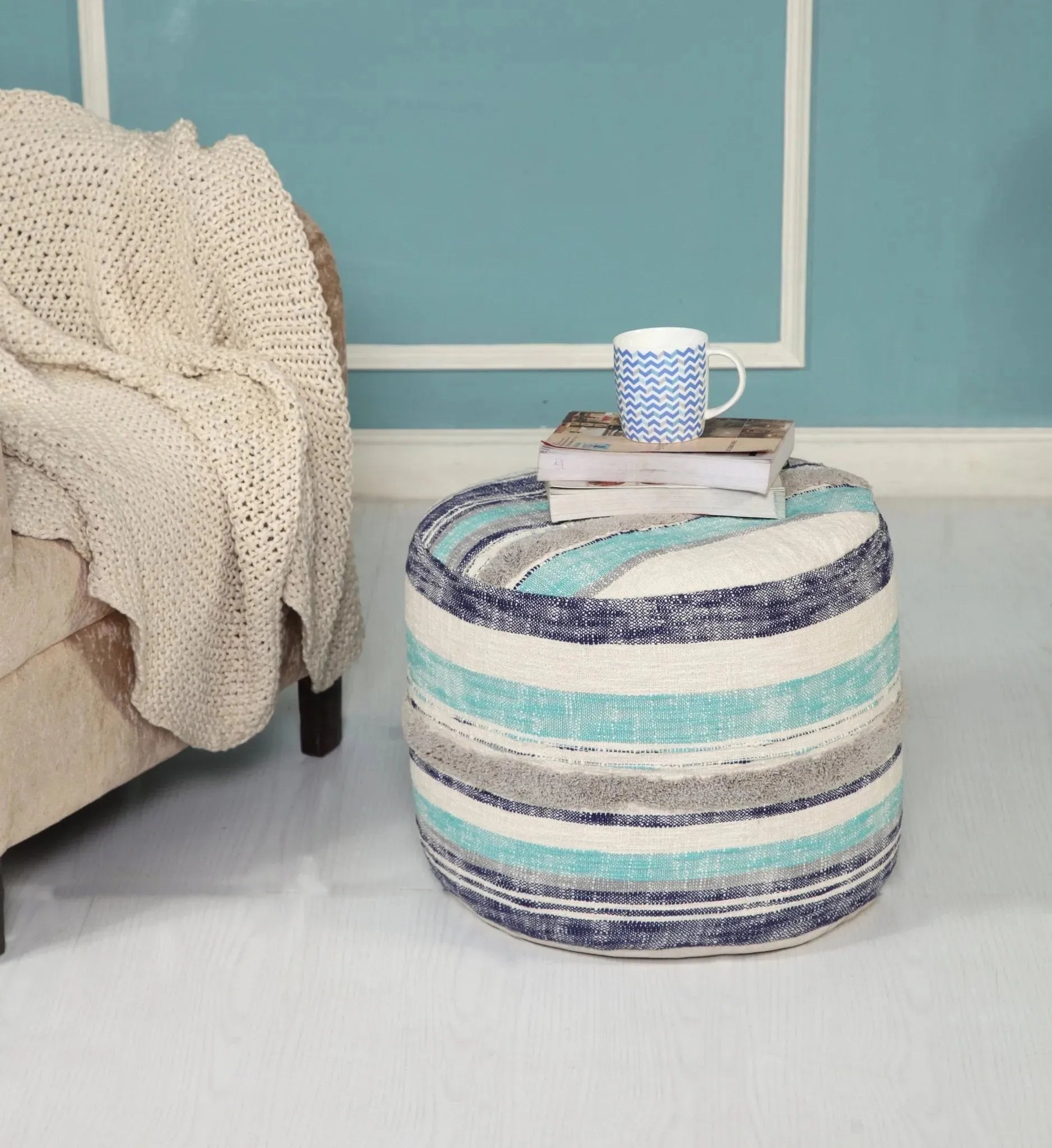 Our pouf collection is made to bring versatility into a space without sacrificing style. The distressed look within this piece adds colors without overwhelming a space, as well as, keeping the design looking fresh for years to come. Use this piece as a extra seat, ottoman, foot rest, or even a small side table. This piece is sure to please your desires by adding functional seating and style to the room.