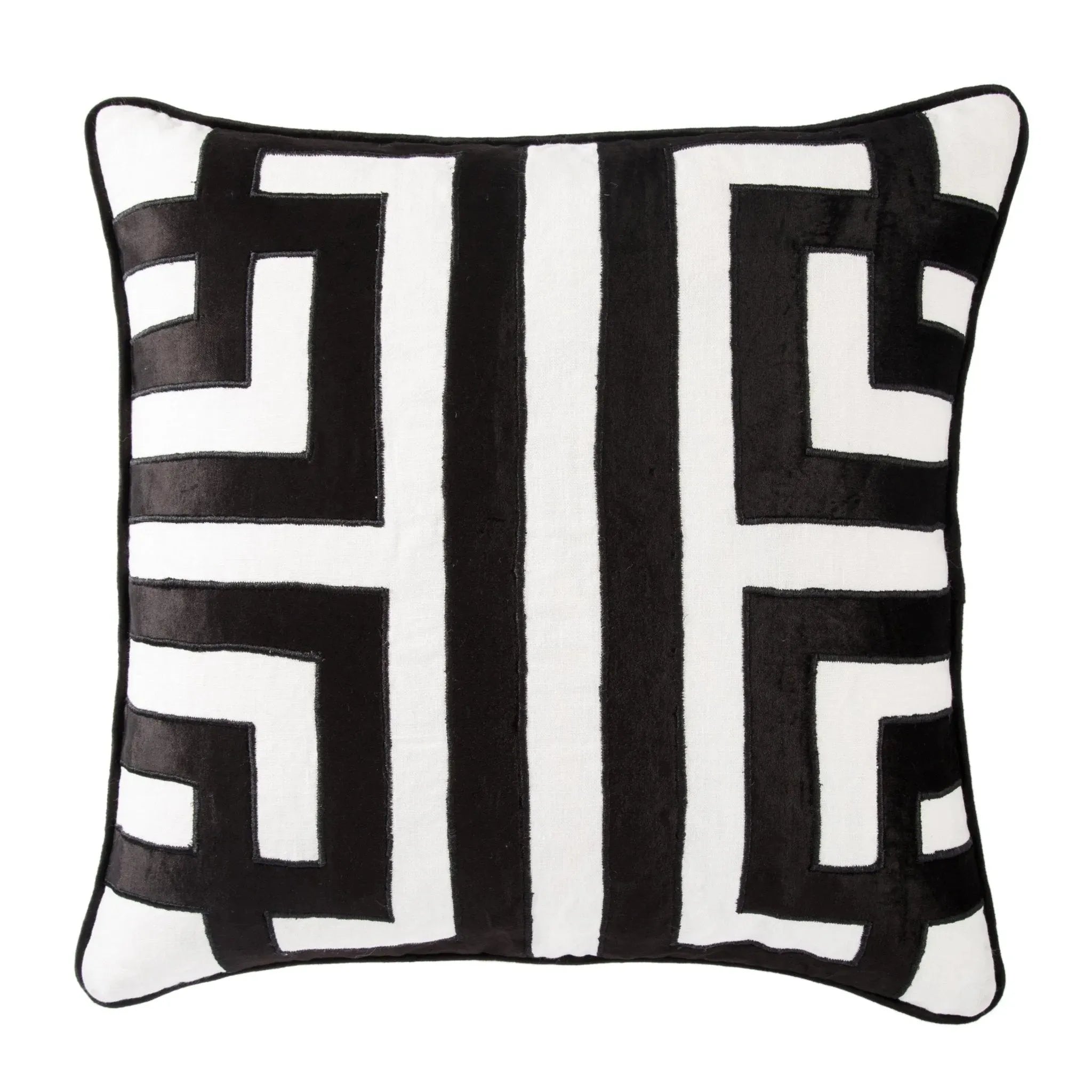 Showcasing a contemporary take on the globally inspired Greek key pattern, this Nikki Chu throw pillow makes a bold statement on sofas and beds. A classic black and white colorway lends a sleek touch to this velvet and linen cushion, while piped edges offer sophisticated detailing.