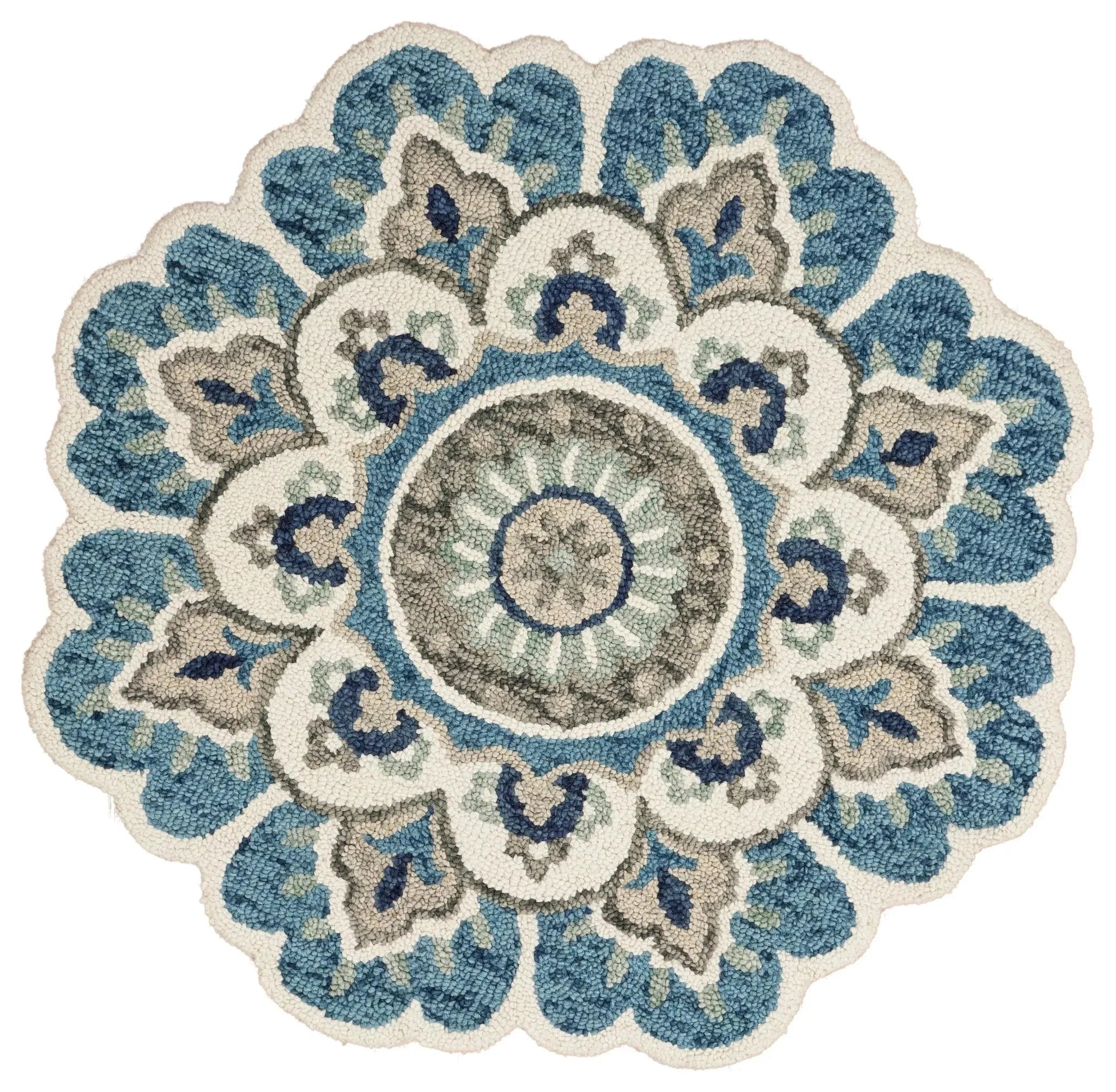 The tranquil colors to this rug are sure to add great style and joy to your home. The scalloped/petaled edge on this piece is sure to add a fun flare to the room. The bordered edge also adds a nice transition from rug to hardwood or carpet. There are endless possibilities of where this piece can be placed in your home or even in an office. Hand tufted in India, this piece has been made with intricate craftsmanship from hardworking hands to your home.