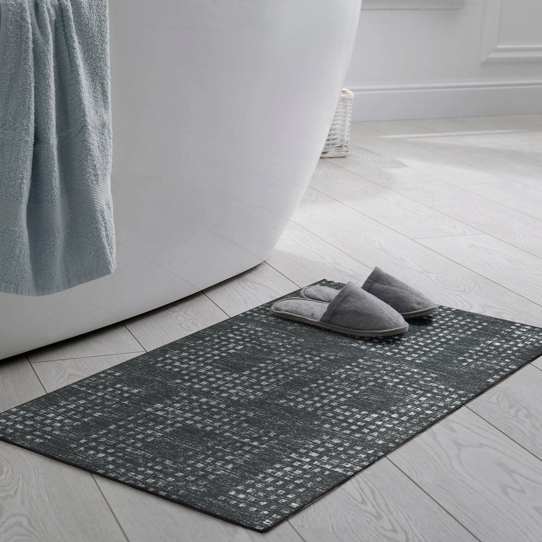 Subtle, multi-tonal geometric style with incredible color movement. Crafted in the USA of a heavy polyester pile with a non-skid backing that is perfect for indoor or outdoor use.
