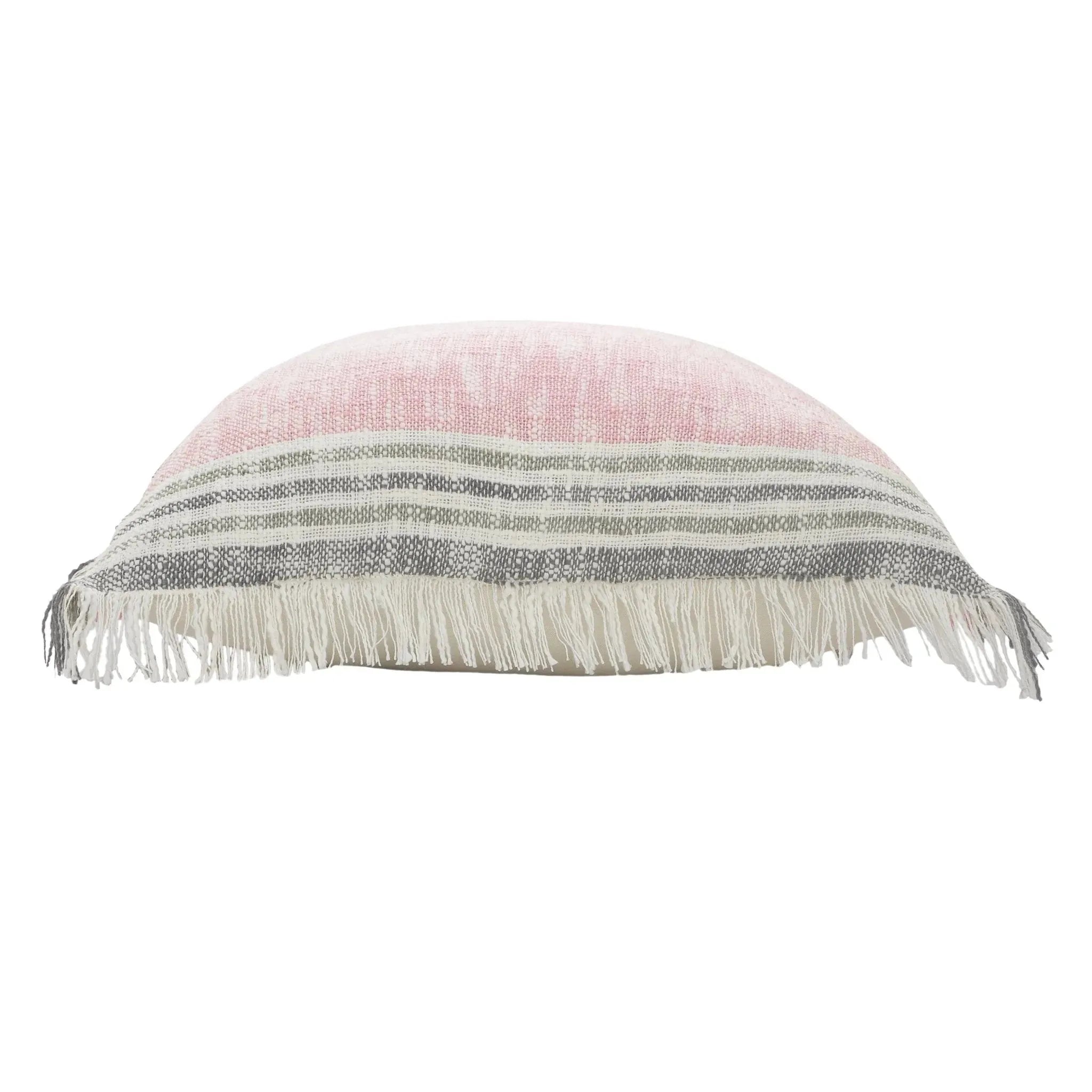 Designed to thrill, our pillow collection will add intricate mastery and eye pleasing designs to any room. This addition dwells perfectly on a comfy couch, bed, or bench. This pillow is a wonderful accent for the home looking to add an eye-catching casual piece to their collection. This piece features a bright pop of pink in the center with a bordered stripe design and all-around textured fringe. Handcrafted with the customer in mind, there is no compromise of comfort and style with the pillow line we create.