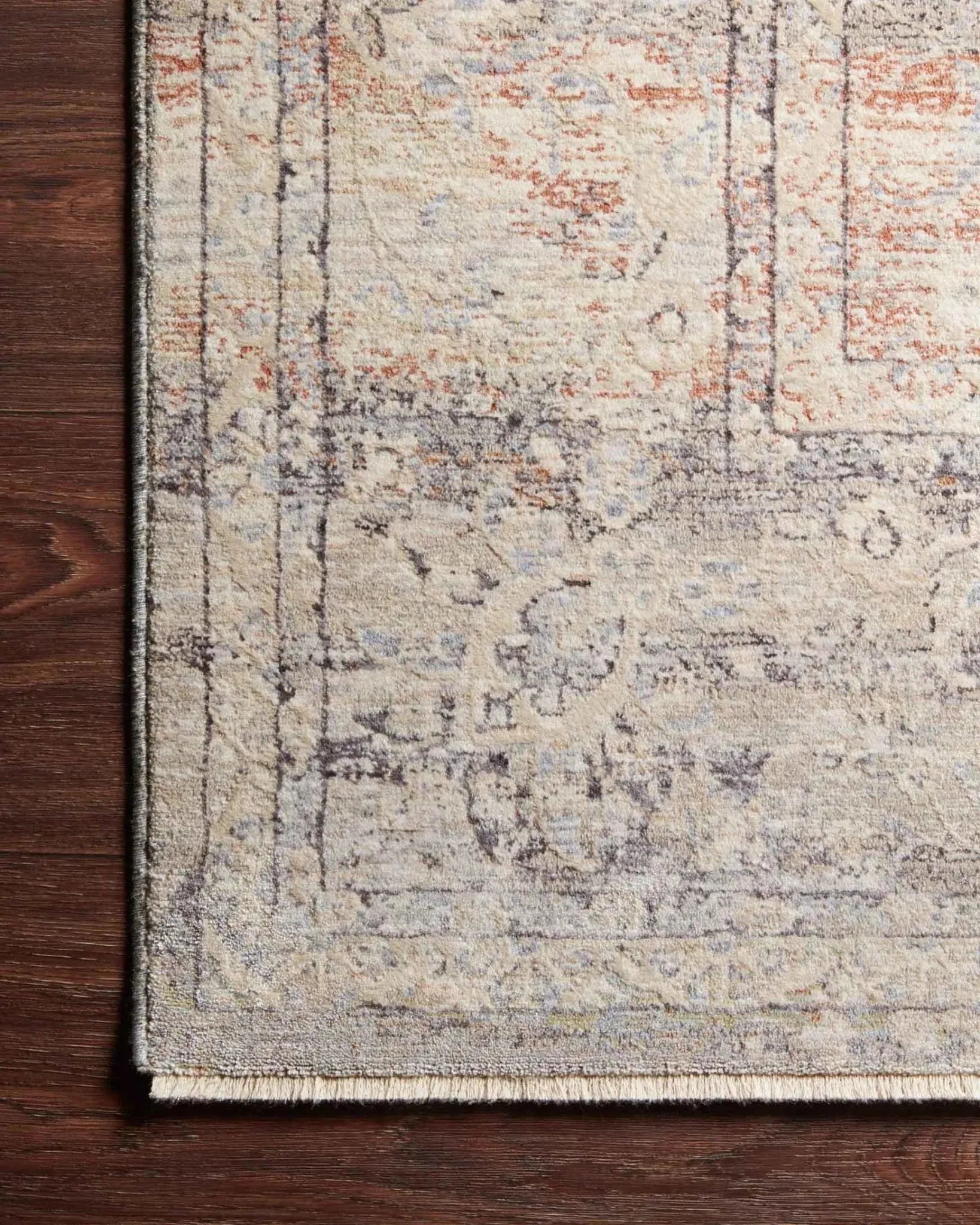 Power-loomed of polyester and viscose in Turkey, the Faye Collection displays a soft color palette and a mix of distressed and traditional-inspired motifs.