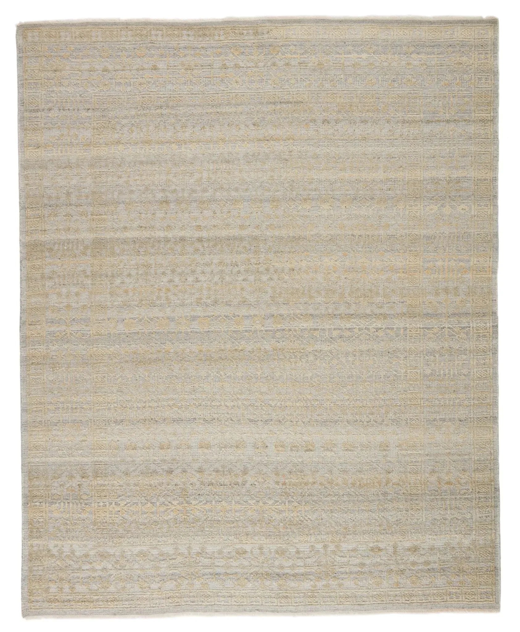 The textural and intricate Gaia collection boasts an assortment of transitional filigree motifs in easily decorated color schemes. Crafted with a high-low carved texture, the hand-knotted Arinna rug features a neutral gray, cream, and light beige colorway for a soft, serene look. The space-dyed effect of the wool and viscose yarns lends a one-of-a-kind quality to every design.