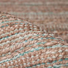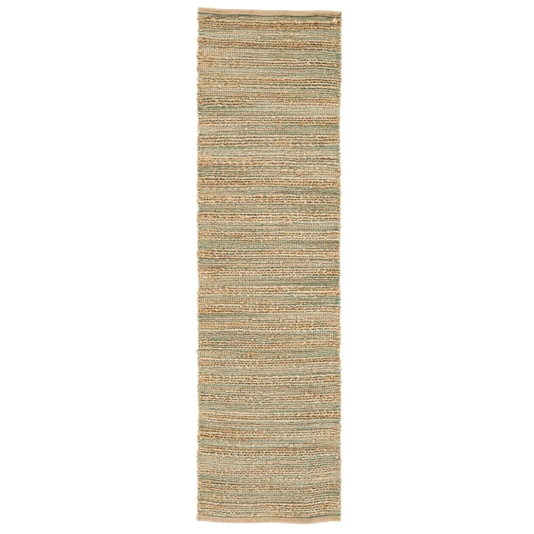 A natural area rug with a contemporary touch, this cotton-backed layer's golden beige tone and hints of green and pale blue striated accents make a cool, casual statement. The organic texture of the hand-woven rayon and jute fibers offers an intriguing feel and bohemian-inspired style.