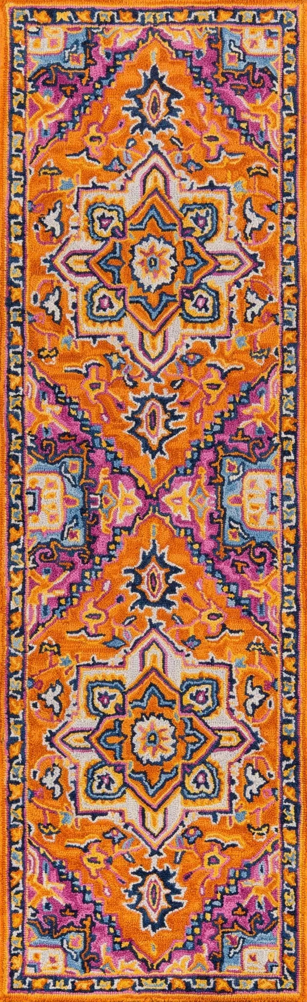 The saturated shades of this decorative area rug reinvent the classic Persian carpet in a vivid color palette. The captivating assortment offers a modern interpretation of traditional rug motifs, as vibrant pink, orange, blue and yellow tones form flowers, vines, palmettes and medallions in colors beautiful and bold. Hand tufted from 100% natural wool, each floorcovering makes a dramatic design statement as a focal point on floors throughout the home. This rug is perfect for your living room, dining room, den, bedroom, or any living space