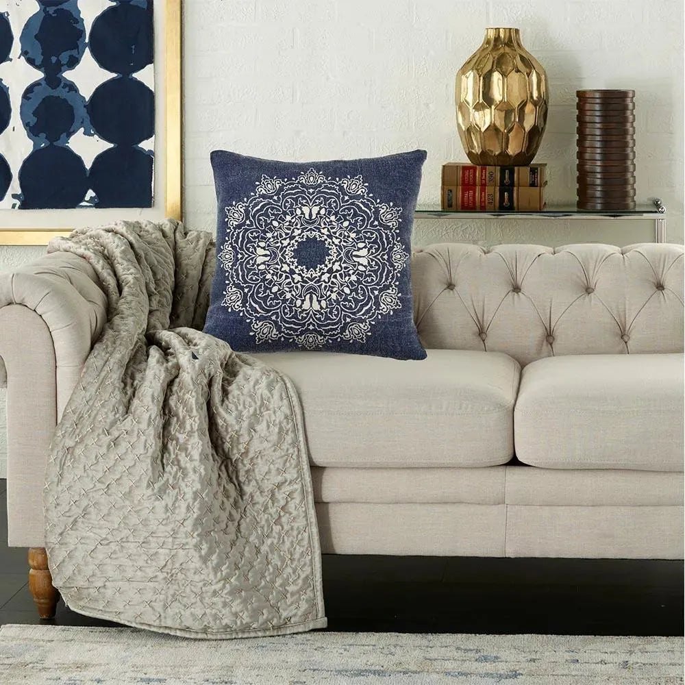 Designed to thrill, our pillow collection will add intricate mastery and eye pleasing designs to any room. Add this pillow to your collection for an intricate design that is sure to catch the eye! The denim and cream coloring make this pillow a neutral addition that adds great design without overwhelming the space. Get cozy with this masterpiece by adding it to a bed, bench, or couch. Hand-crafted with the customer in mind, there is no compromise of comfort and style with the pillow line we create.