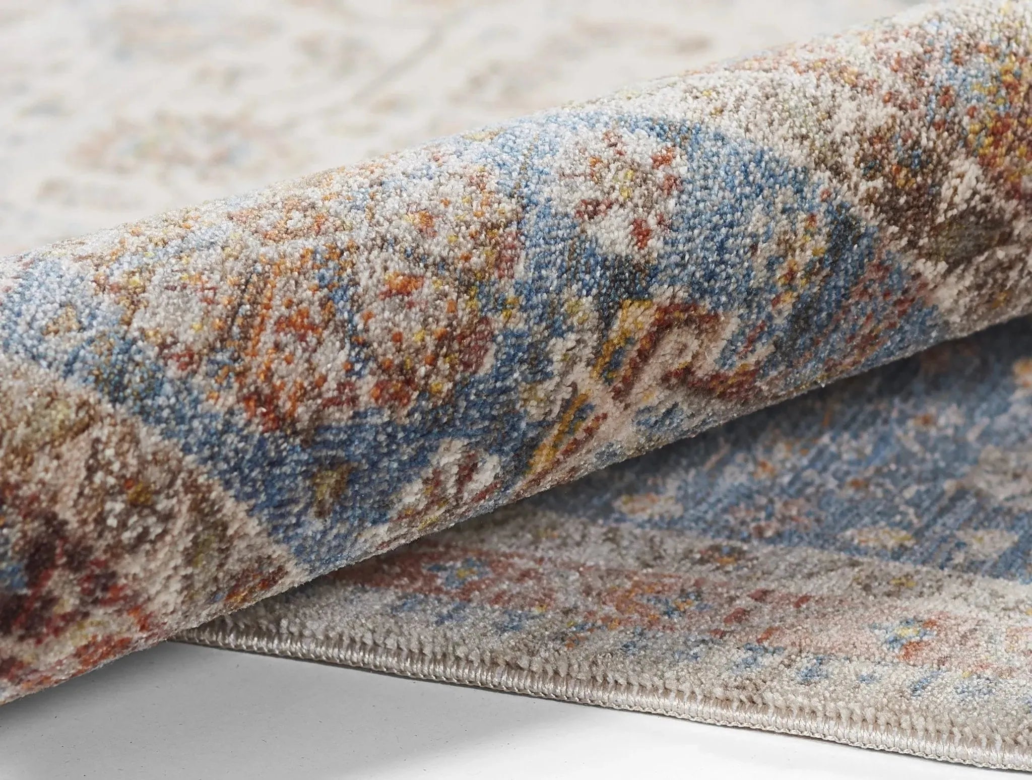 The Parisa PSA06 Denim/Multi Rug comes in various sizes, including 2x10, 5x7, 8x10, 8x11, 9x13, and 12x15 feet, accommodating different room dimensions.