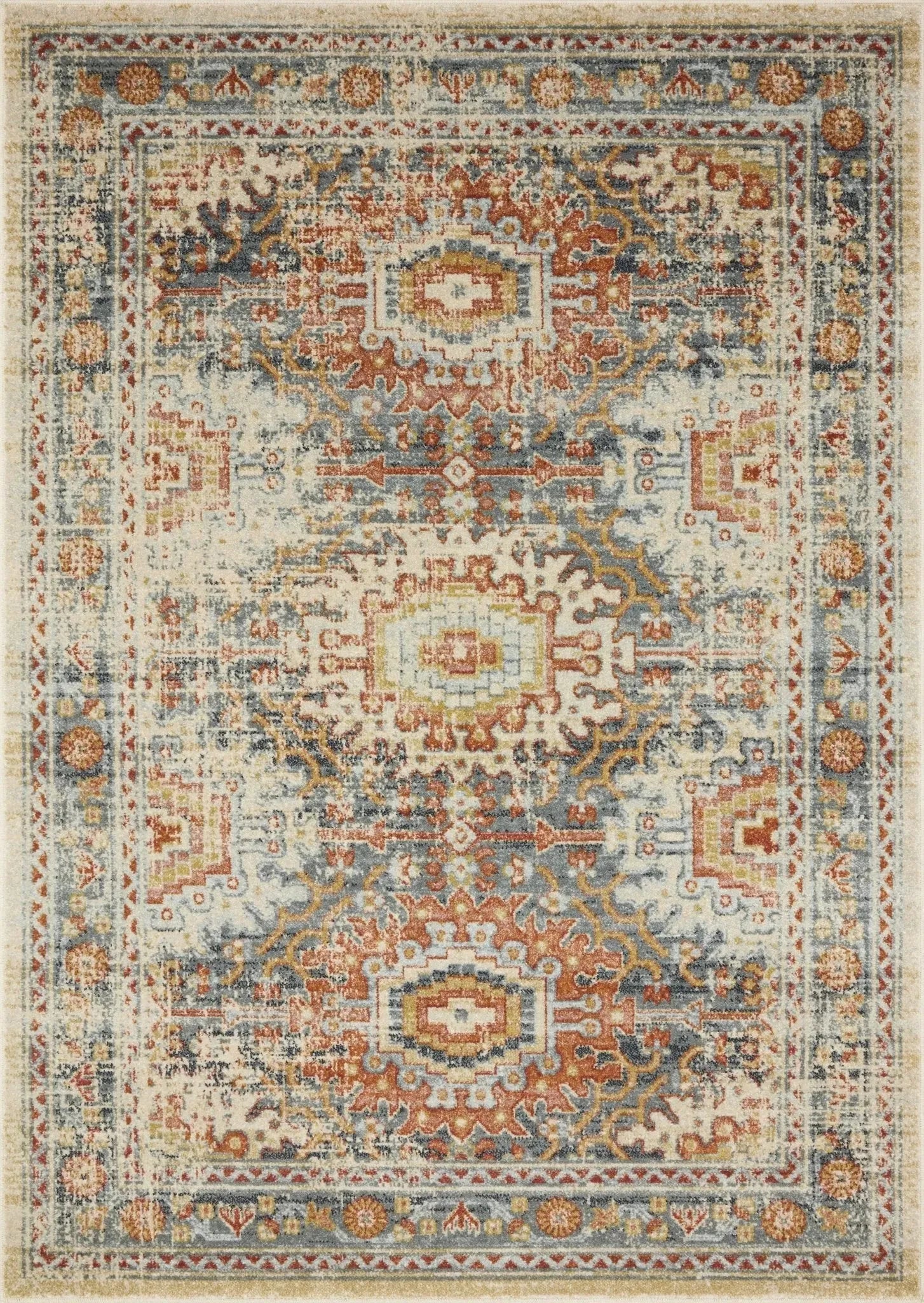 The Parisa PSA06 Denim/Multi Rug comes in various sizes, including 2x10, 5x7, 8x10, 8x11, 9x13, and 12x15 feet, accommodating different room dimensions.