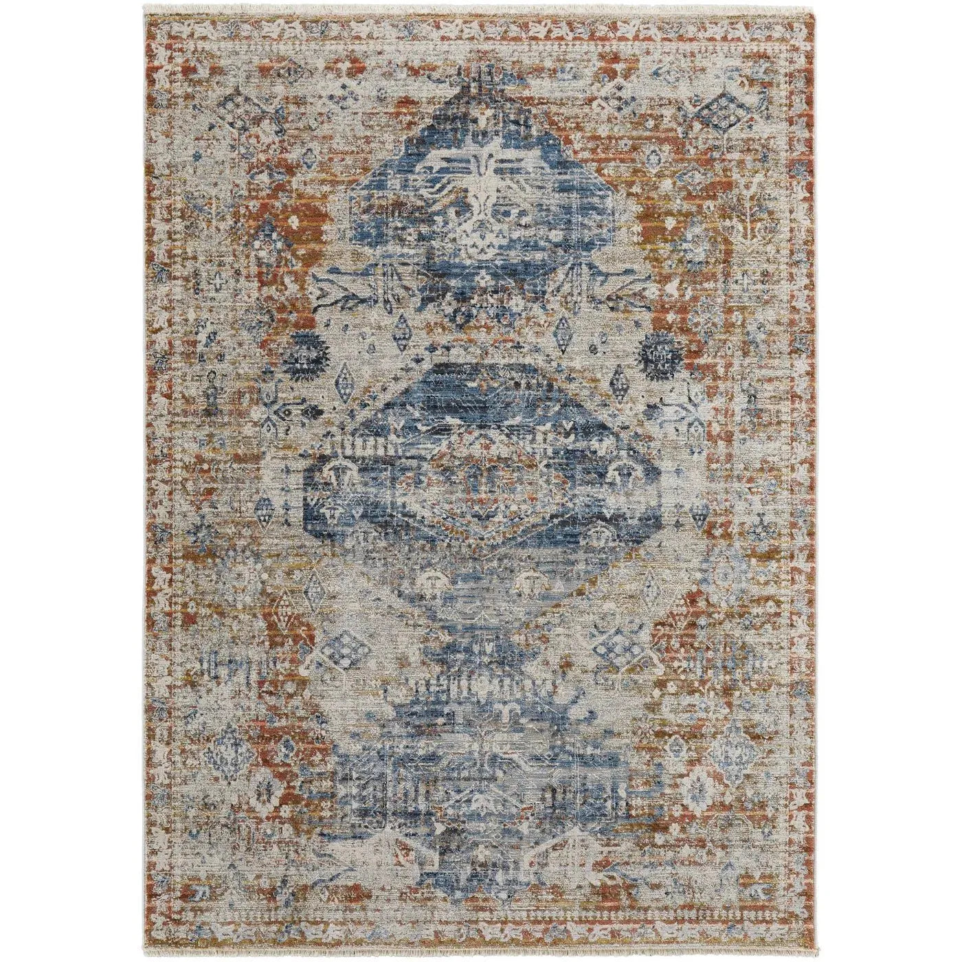 The Parisa PSA06 Denim/Multi Rug comes in various sizes, including 2x10, 5x7, 8x10, 8x11, 9x13, and 12x15 feet, accommodating different room dimensions.