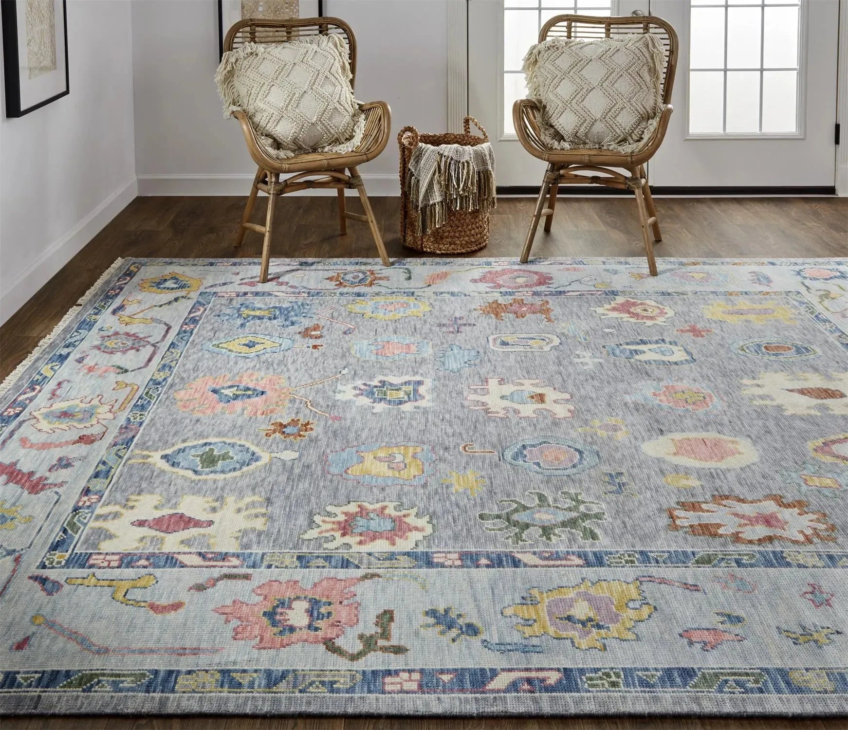 The Parisa PSA06 Denim/Multi Rug comes in various sizes, including 2x10, 5x7, 8x10, 8x11, 9x13, and 12x15 feet, accommodating different room dimensions.