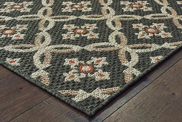 The Latitude collection showcases sophisticated designs ranging from traditional tile and medallion patterns to simple modern borders and geometrics. Multi-colored yarns in neutral grays, accented by tones of deep navy and vibrant persimmon, add texture and a pop of color underfoot. Machine-woven of polypropylene, Latitude is easy to care for and can be used both indoors and out.