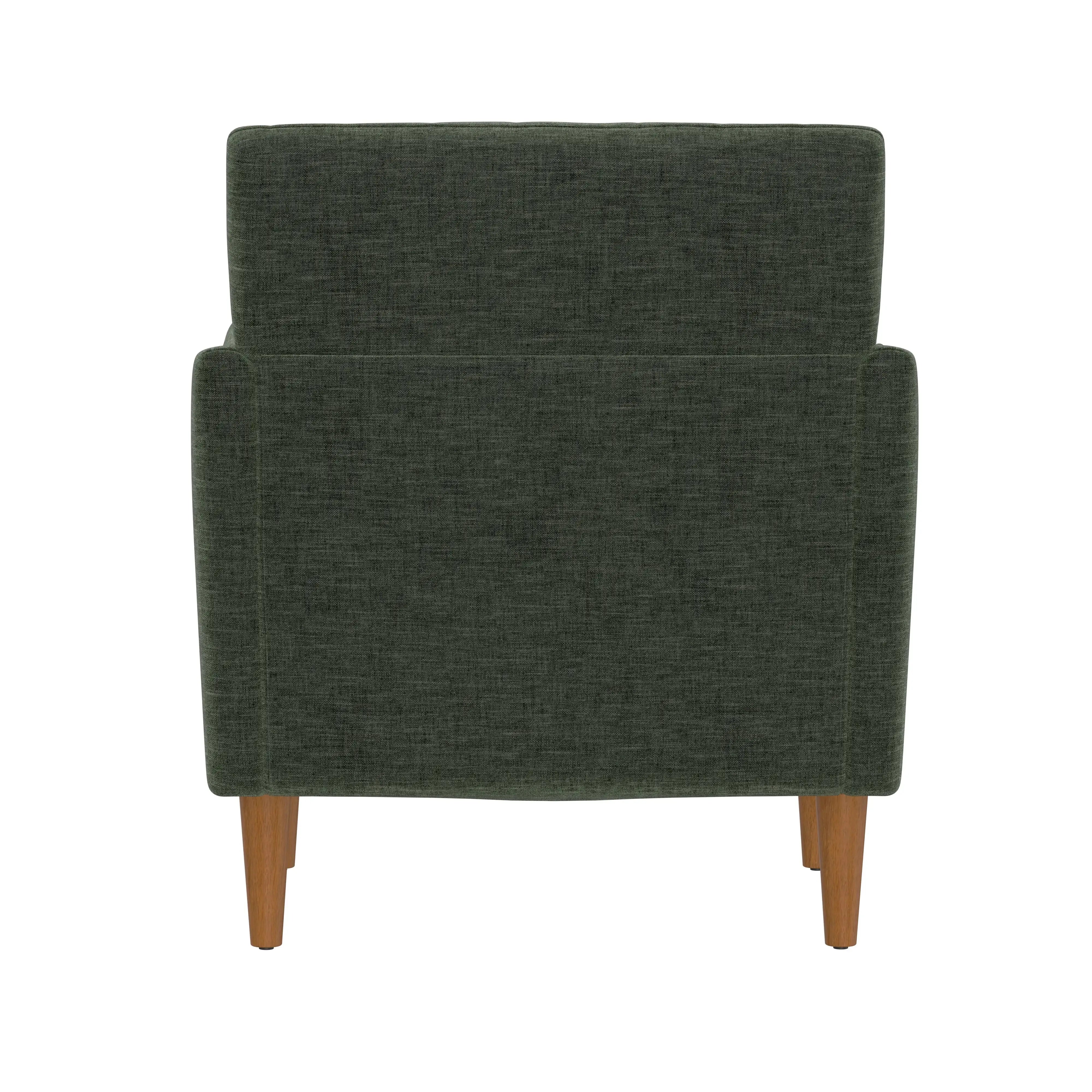 Cozy up to the soft chenille fabric of the Letty accent chair. Dark juniper green blankets the low profile with a smoothly upholstered back and curved arms. Tall solid wood legs lighten the silhouette as they taper to the floor. Letty’s transitional shape will integrate with many styles, making it a timeless look for years to come.