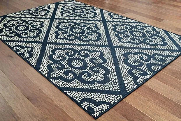 Marina is an elegant new introduction for indoor or outdoor use and features a 100% polypropylene looped yarn made in Egypt. It features a classic neutral palette using high contrast colors like black, ivory, deep navy, sand and cool gray. The collection includes casual but sophisticated patterns like updated geometrics and simplified traditionals that all feel fresh but timeless.