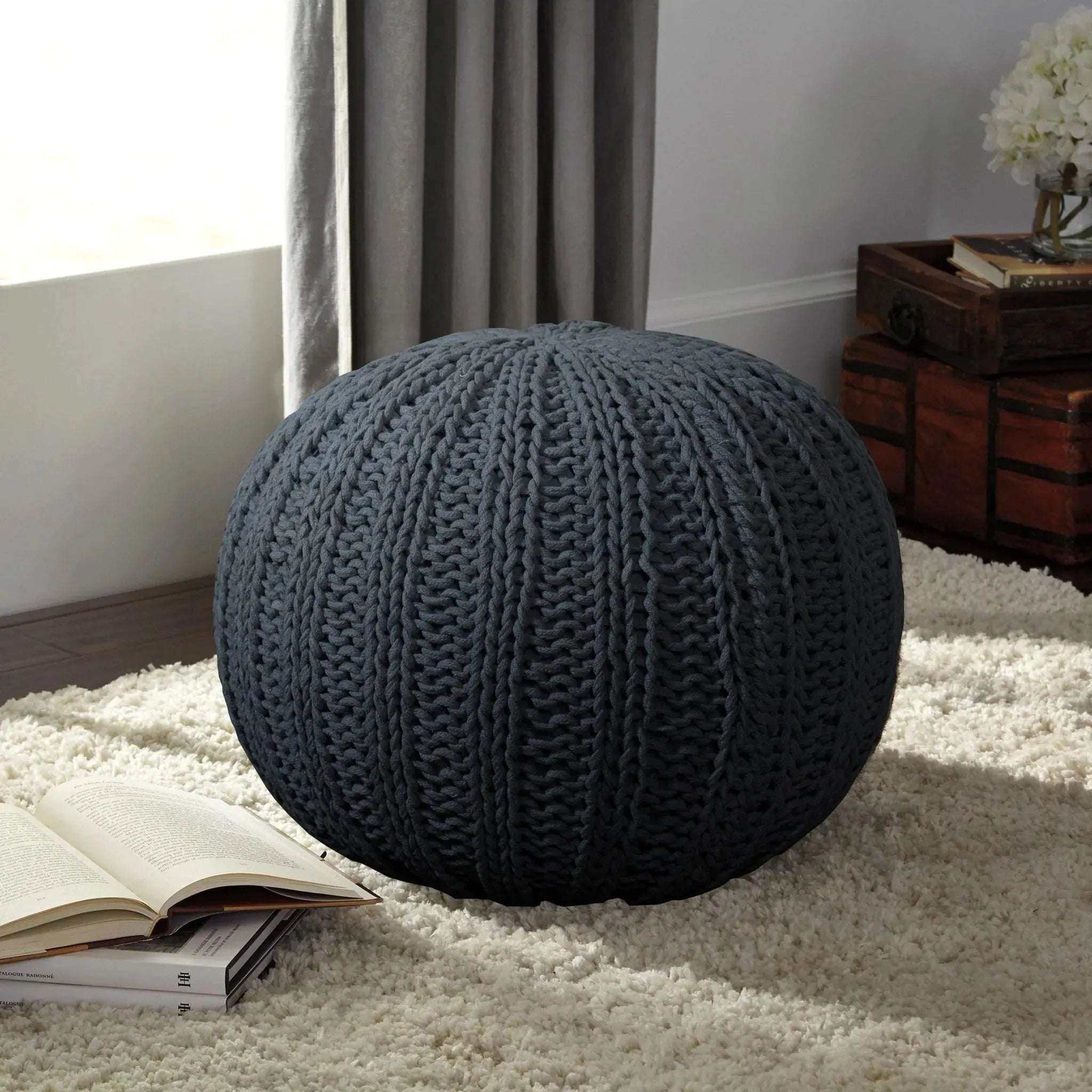 Don't be afraid to explore the versatility of our pouf collection. Designed to be a cozy seat, comfy footrest, or a functional ottoman, this gray minimalist piece is here to please. With woven cotton, this pouf is soft and has textured feel that you won't want to stop touching. It's the perfect addition to a living area, redesigned basement, playroom, or den. This piece is sure to please your desires by adding functional seating and style to the room.