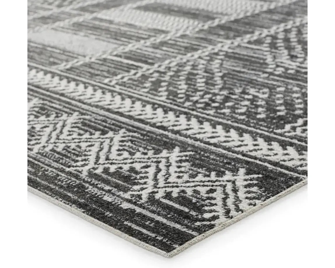 The incredibly chic Nadine collection offers durability and easy-care without compromising one bit on the style. This kid and pet-friendly assortment of rugs features a washable quality and a range of globally inspired designs that anchor rooms with eye-catching appeal. The Mateo rug showcases a modern Moroccan pattern in light gray on a cream, gray, and black striated background. The 100% polyester fibers provide a slight sheen and lasting quality that thrives in high traffic areas of the home such as kitchens, halls, bathrooms, living rooms, and bedrooms.