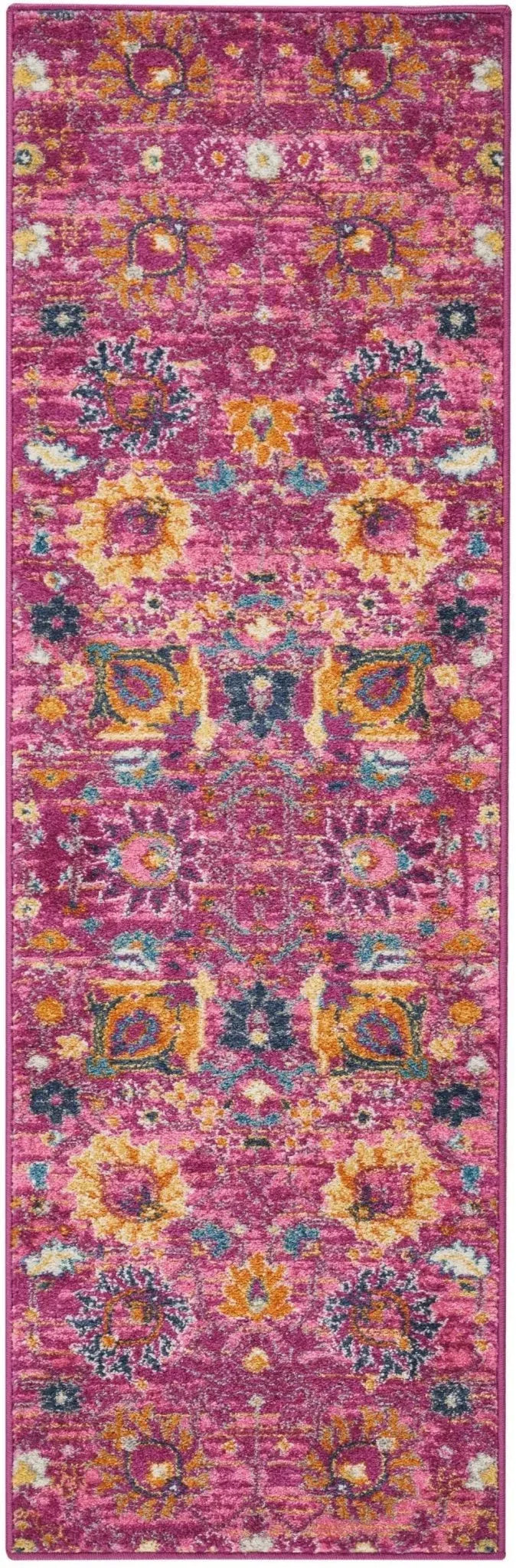 The rug showcases an exceptional Persian floral design with curvaceous leaves, bright blossoms, and other classic botanical motifs, bringing vivid energy to your living space.