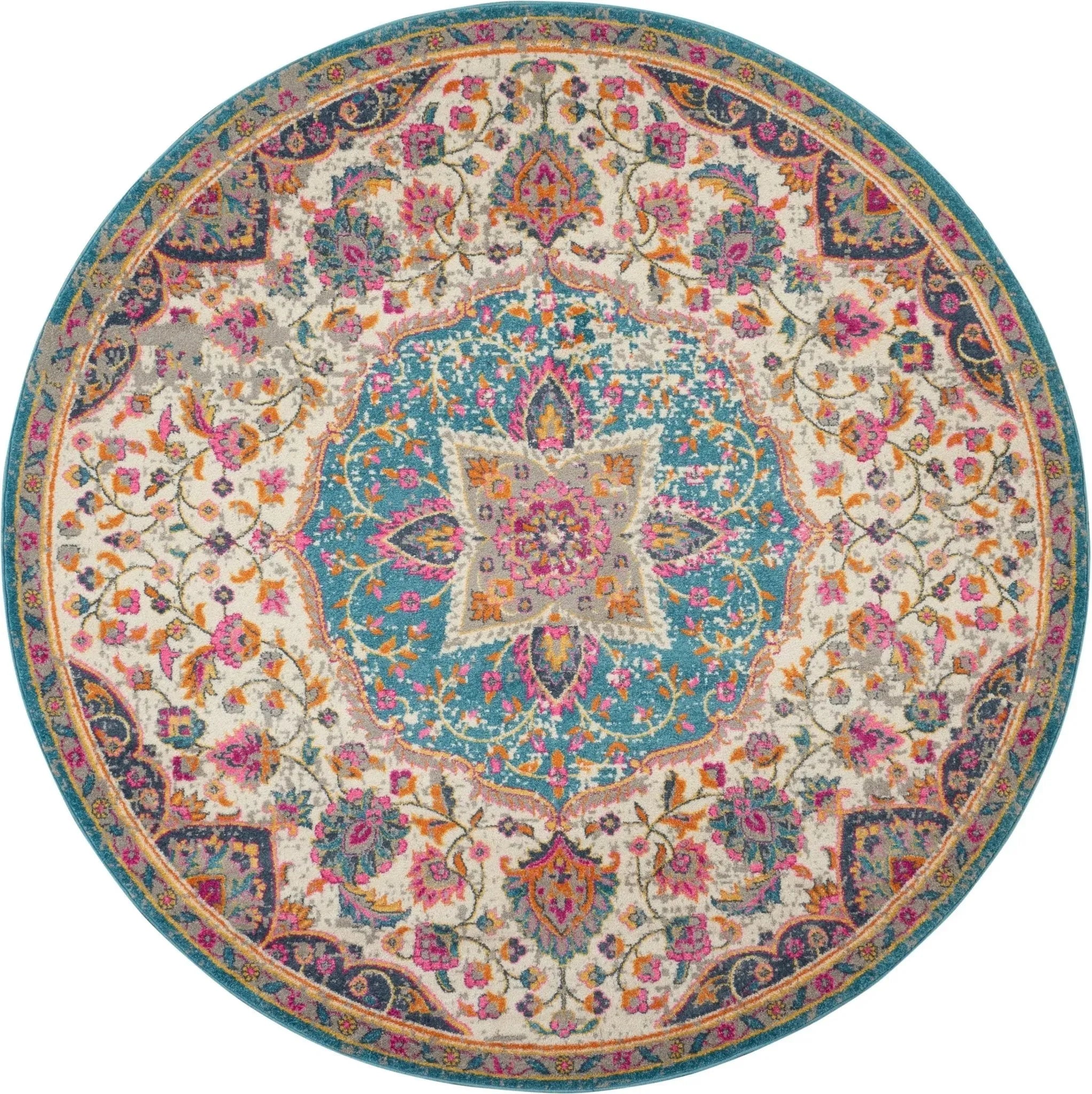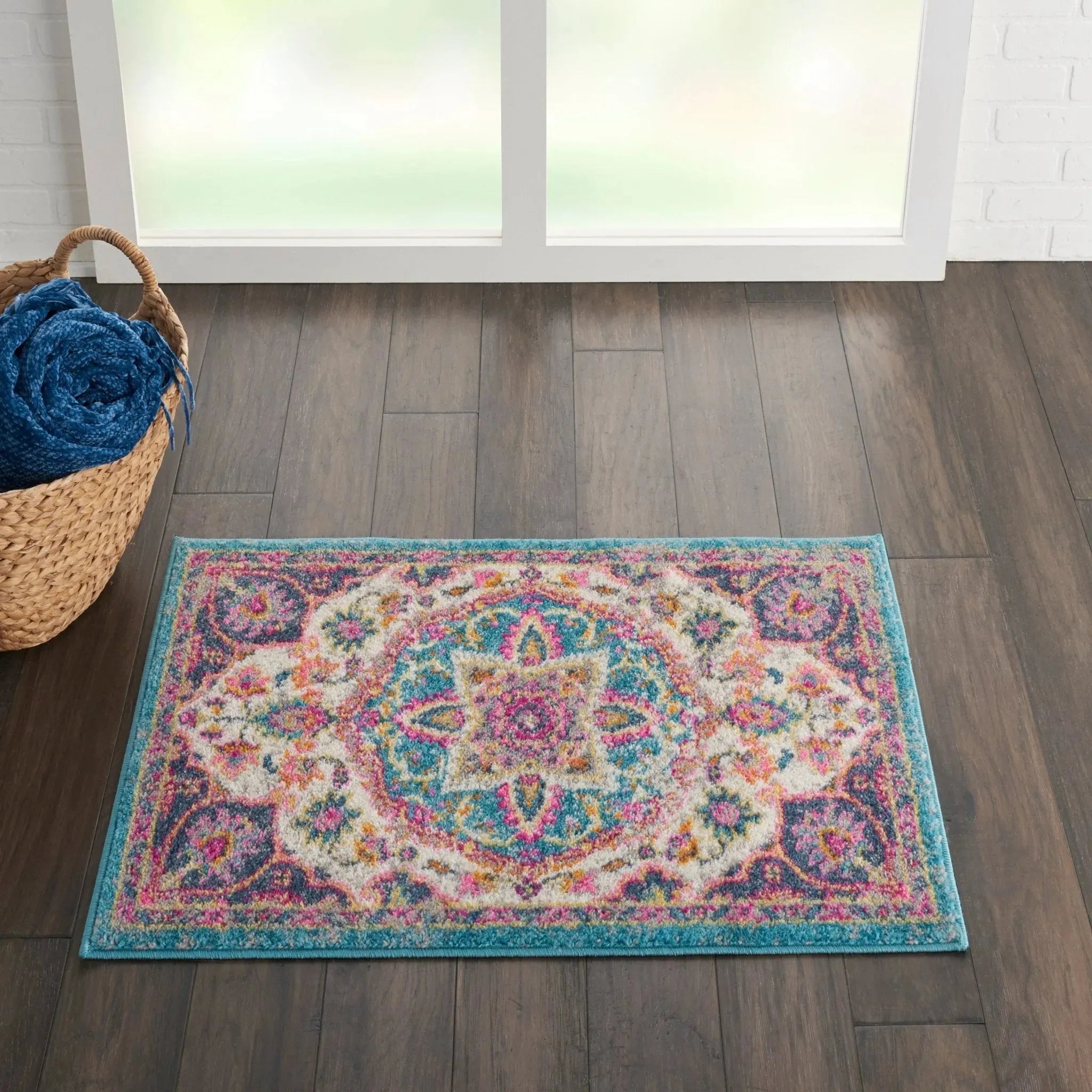 The Parisa PSA06 Denim/Multi Rug comes in various sizes, including 2x10, 5x7, 8x10, 8x11, 9x13, and 12x15 feet, accommodating different room dimensions.