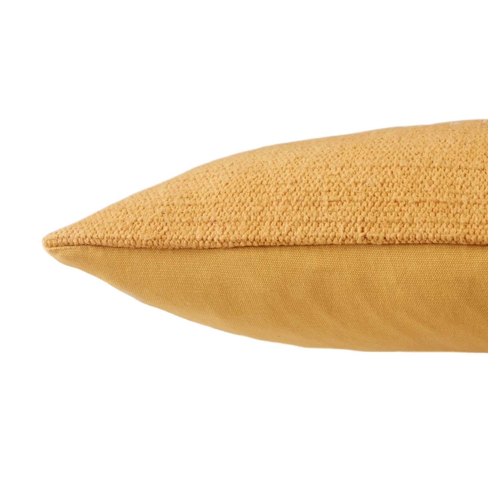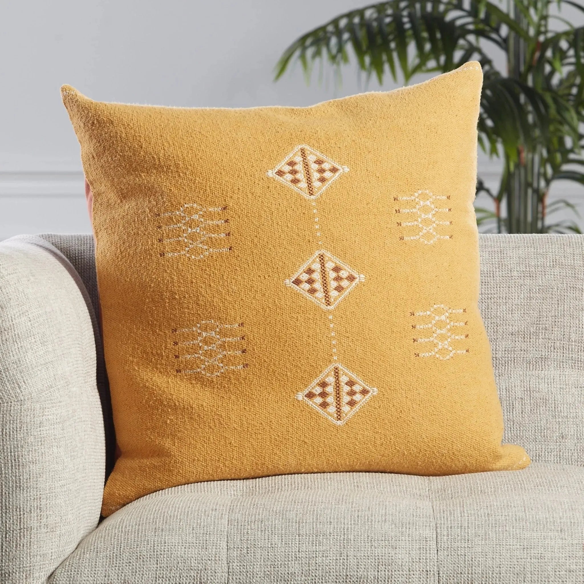 Inspired by Moroccan Sabra styles, the Puebla collection boasts vibrant color palettes and intricate tribal embroidery. The Nufisa throw pillow features an on-trend mustard yellow colorway with warm taupe and white details accenting the textural, cotton weave.