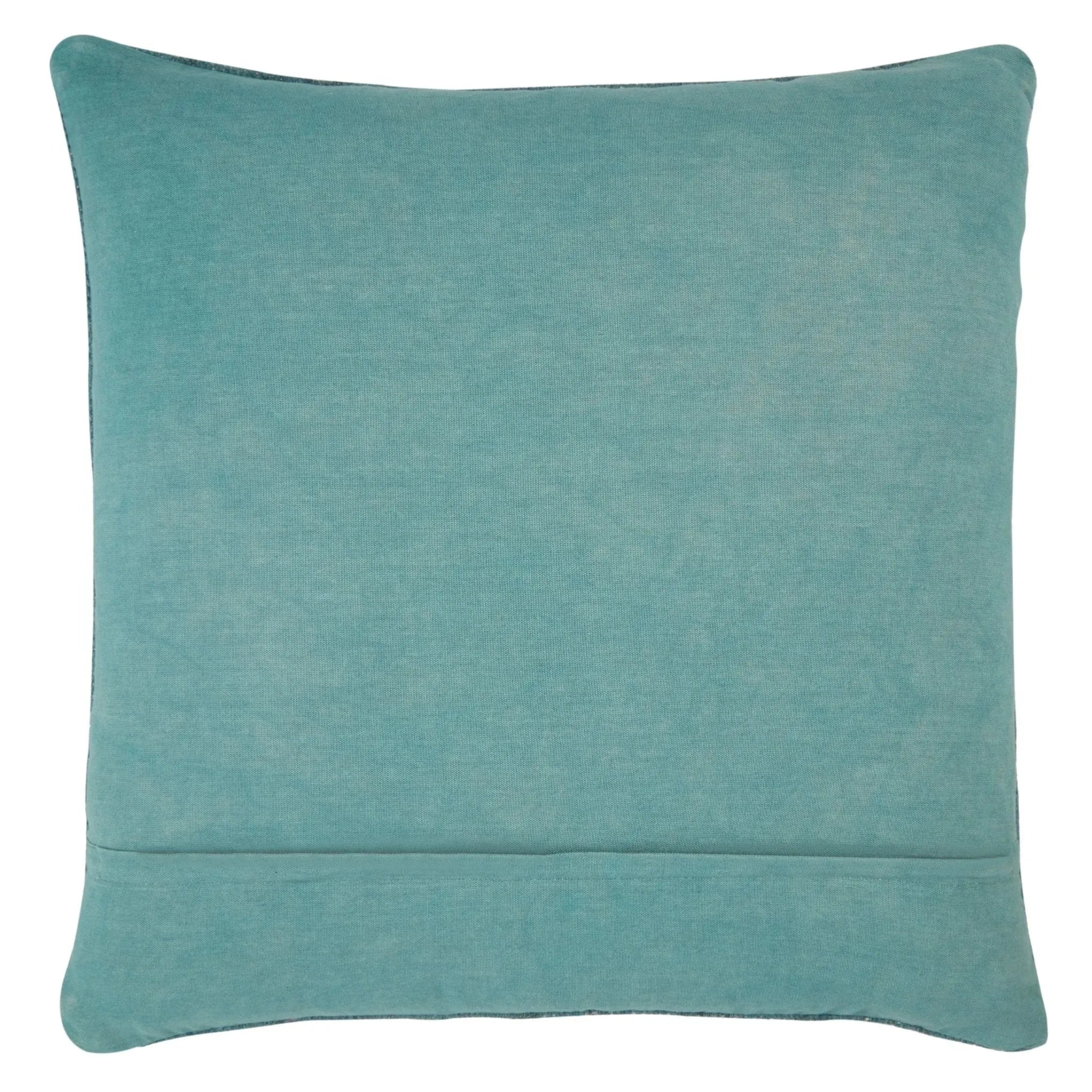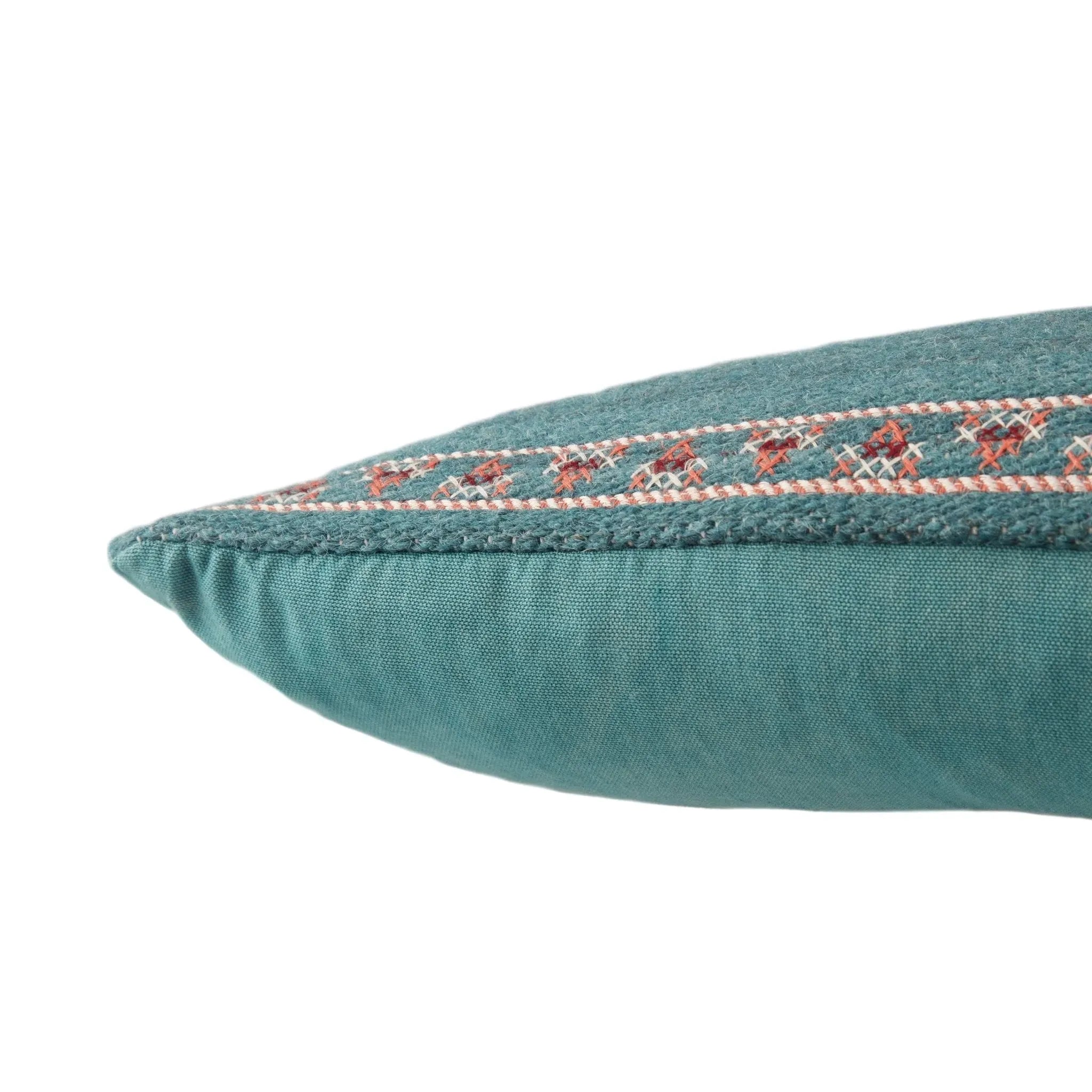 Inspired by Moroccan Sabra styles, the Puebla collection boasts vibrant color palettes and intricate tribal embroidery. The Zaida throw pillow features an on-trend teal and terracotta colorway with white details and a textural, India-sourced wool and cotton weave.