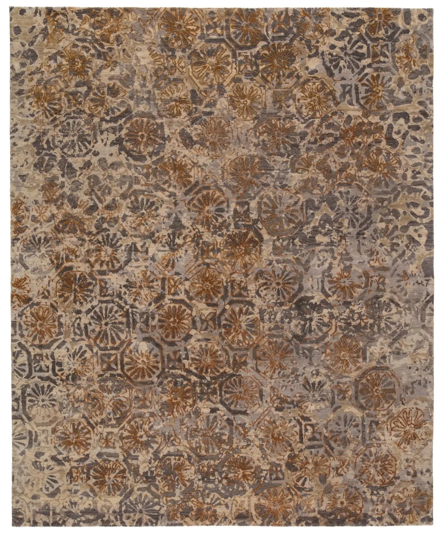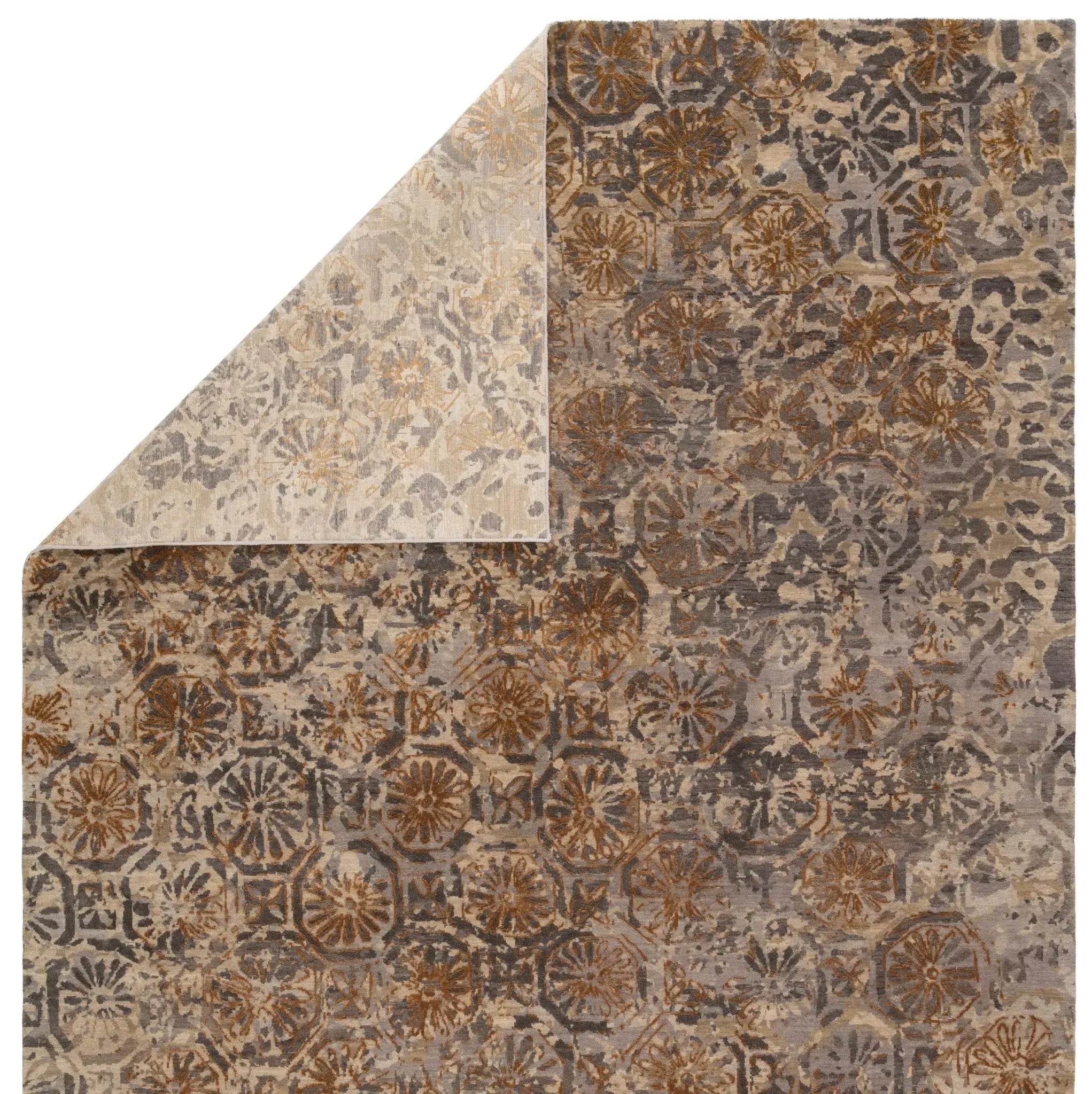 Steeped in both history and modern style, the Reconnext collection by Jenny Jones combines globally inspired motifs with on-trend colorways and re-imagined patterns. From animal prints and brilliant tilework to indigenous art and natural landscapes, Africa is a country filled with awe-inspired beauty. The hand-knotted Madagascar wool and luxe silk rug layers these striking impressions into a unified statement, complemented by a rich, neutral palette of deep ocher and gray tones.