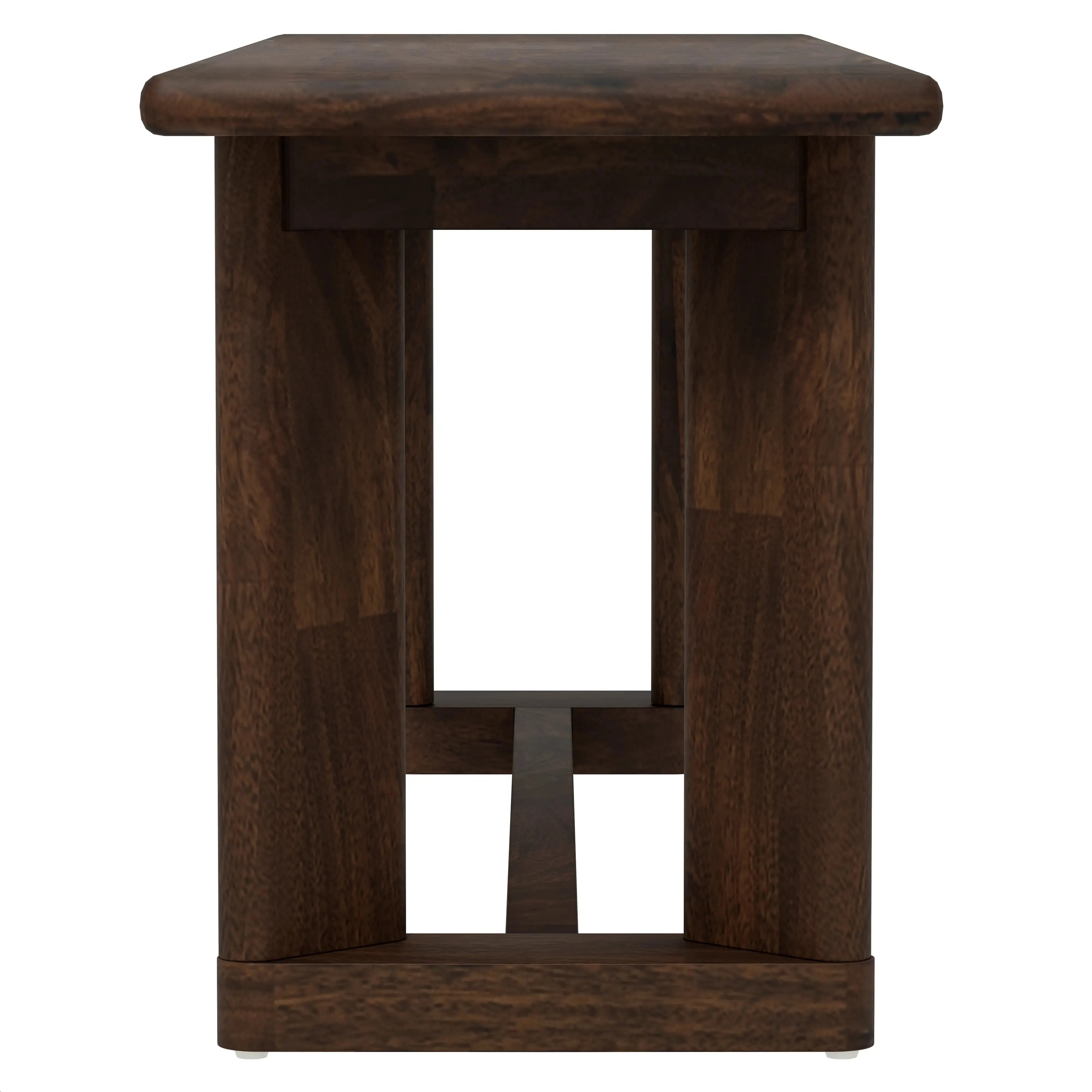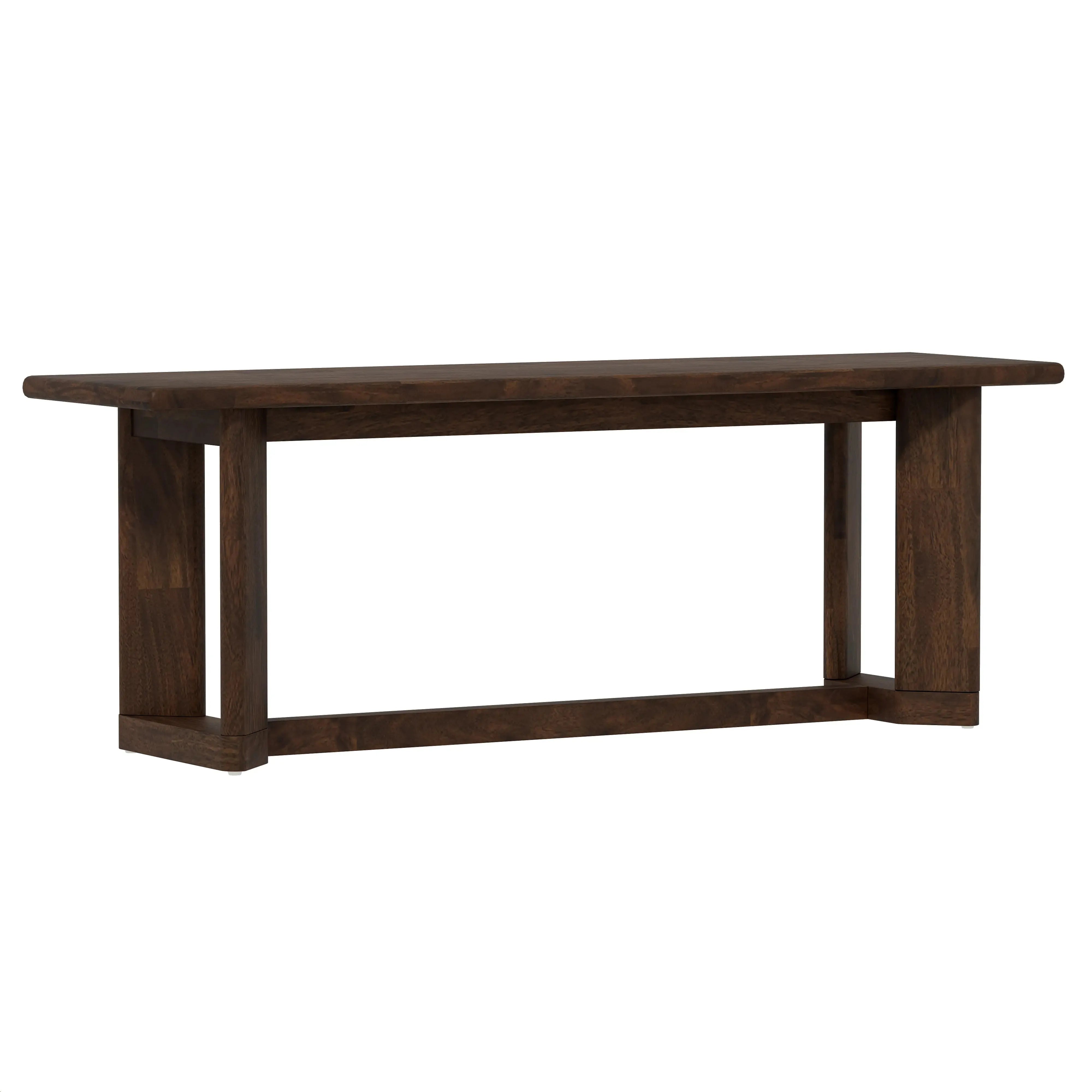 Sleek contemporary lines with intriguingly angled legs may catch your attention but the details of the Ronan collection will draw you in. Mango veneers applied over hardwood solids are polished off in a rich brown finish that flaunts the deep natural variations of the wood grain. Gently rounded edges pair with soft, textured fabric on the fully upholstered chairs and stools with tufting and exposed back frame details. In dining and gathering heights and a matching server, the Ronan collection proves that elevated and sophisticated can also be warmly inviting.