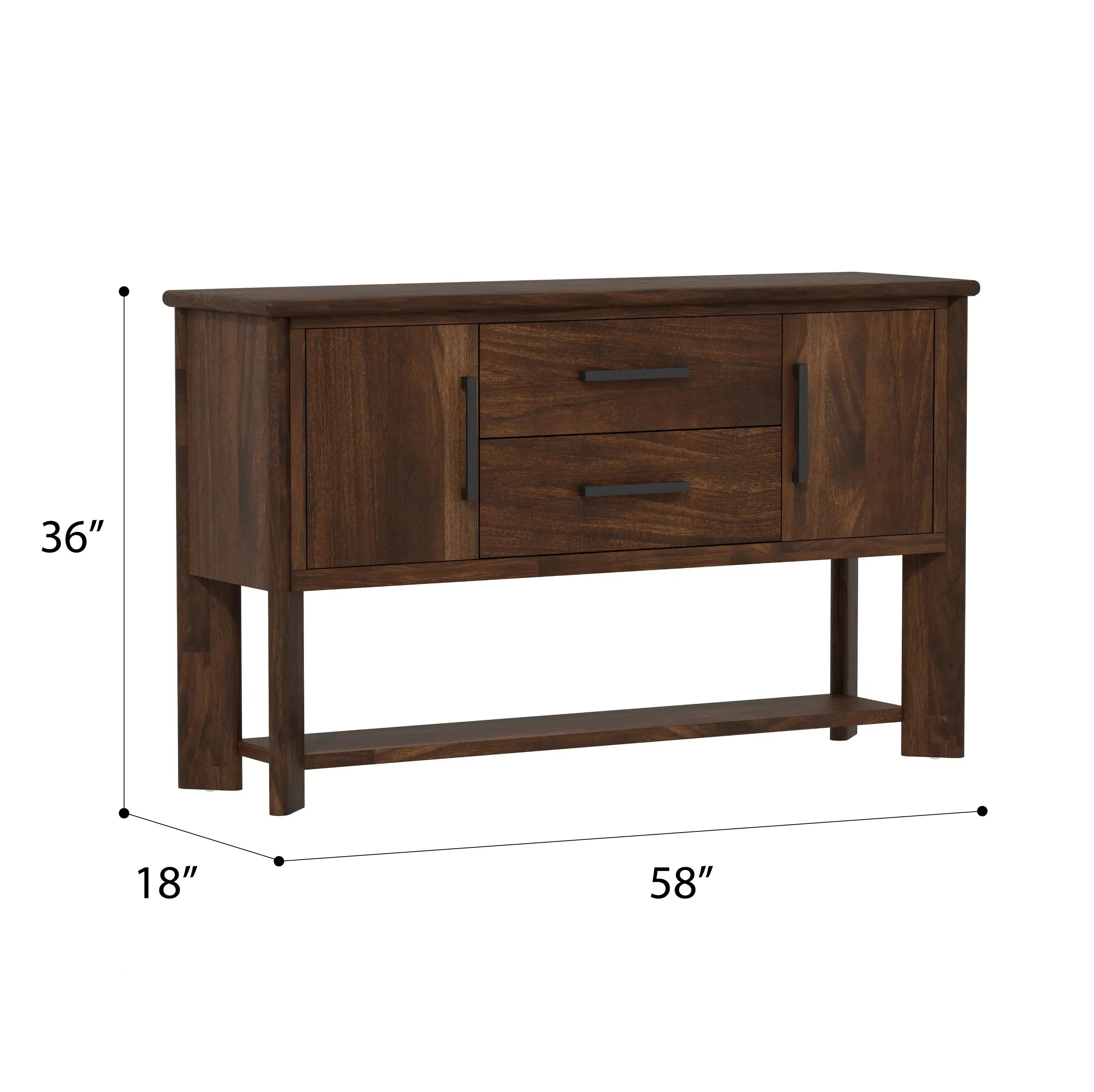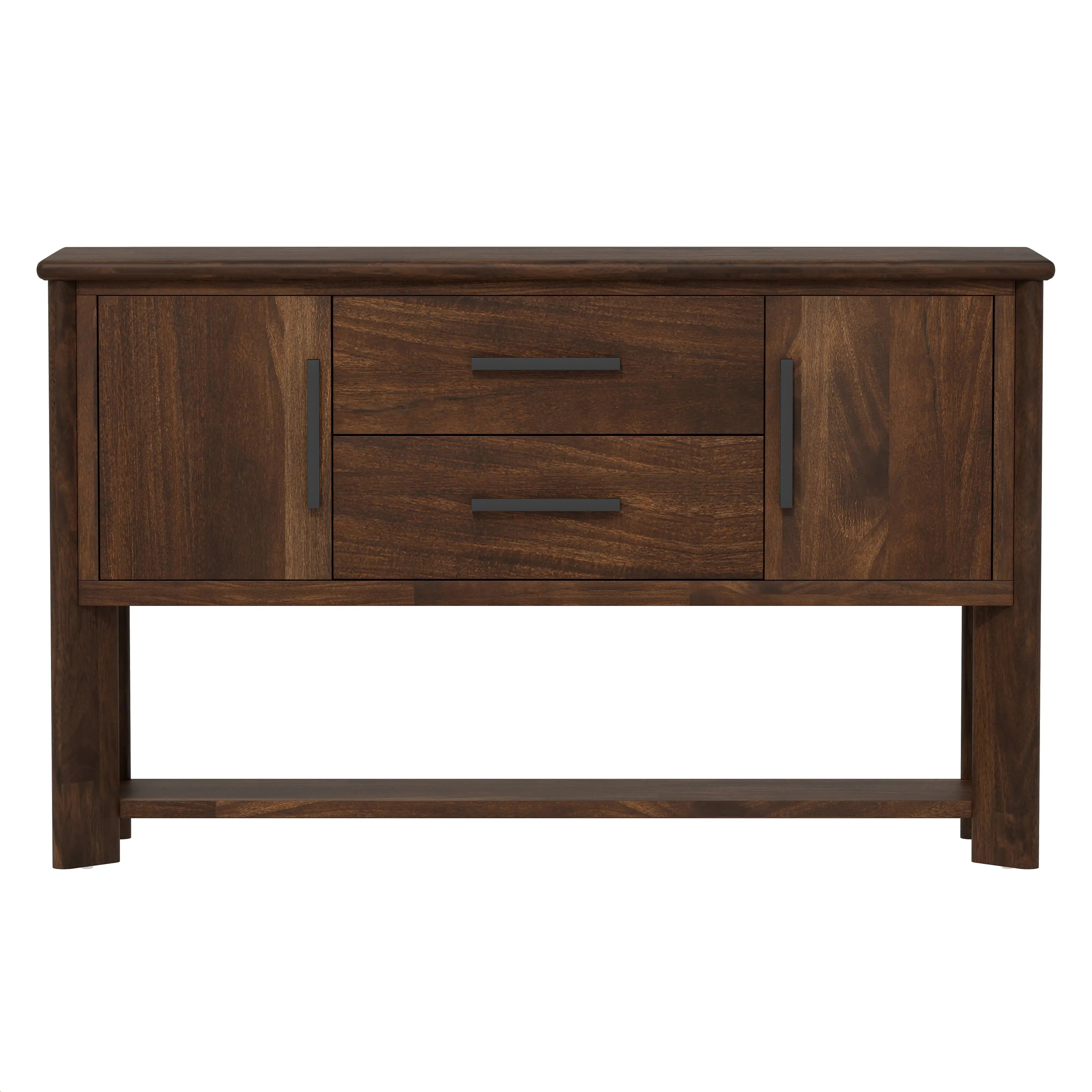 Sleek contemporary lines with intriguingly angled legs may catch your attention but the details of the Ronan collection will draw you in. Mango veneers applied over hardwood solids are polished off in a rich brown finish that flaunts the deep natural variations of the wood grain. Gently rounded edges pair with soft, textured fabric on the fully upholstered chairs and stools with tufting and exposed back frame details. In dining and gathering heights and a matching server, the Ronan collection proves that elevated and sophisticated can also be warmly inviting.