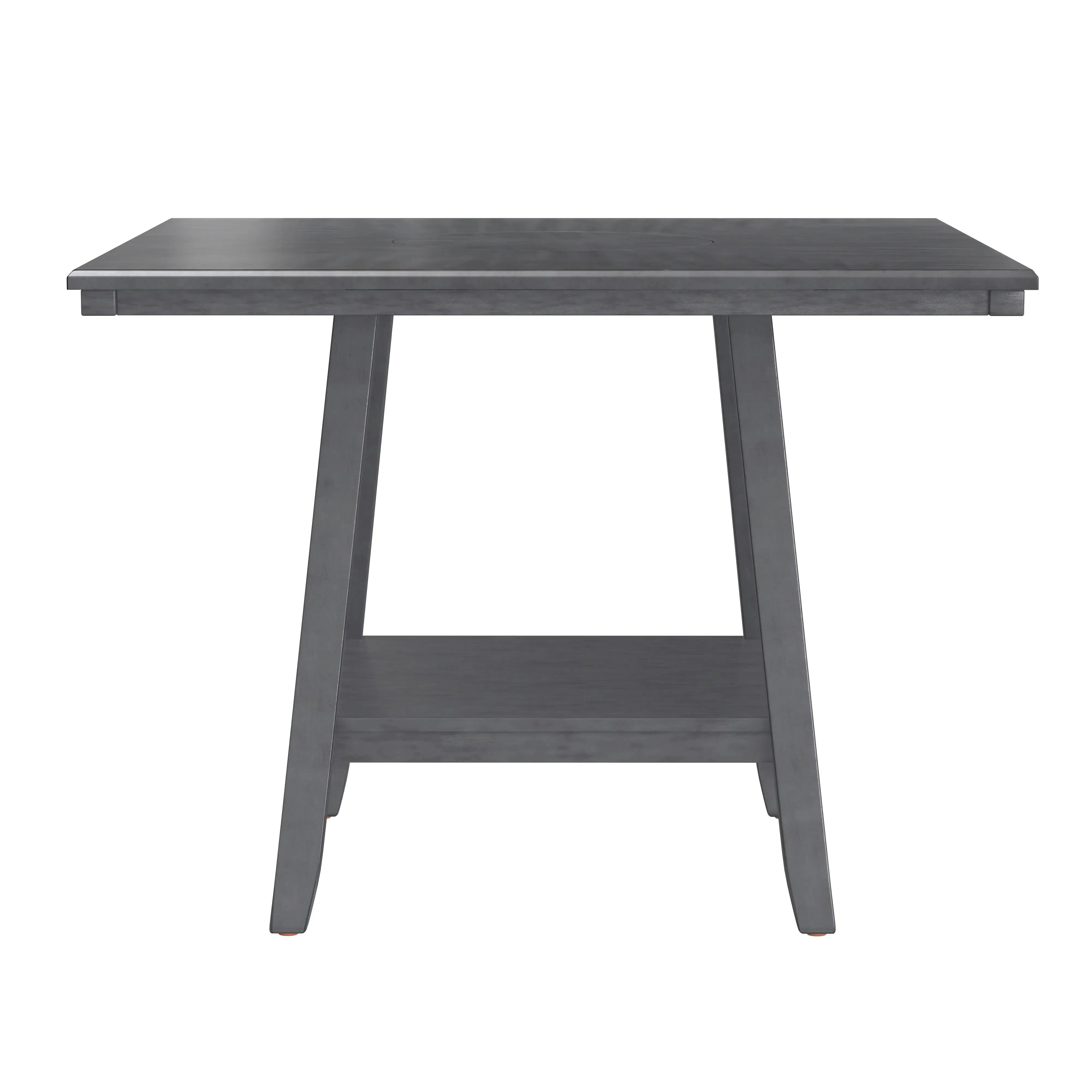 The transitional Seneca collection hosts a unique blend of features and seating options. A delightful medium gray finish on walnut veneers forms a quarter-turned pattern on the tabletop, culminating in the built-in 18” lazy Susan. The tapered frame spreads out to encompass a lower shelf for extra storage. Seating with light gray upholstery and gently curved backs decorated with nailhead trim, you can stay more traditional with just stools or more casual by mixing in a bench or two. Accentuate your personal style and give the Seneca a whirl.