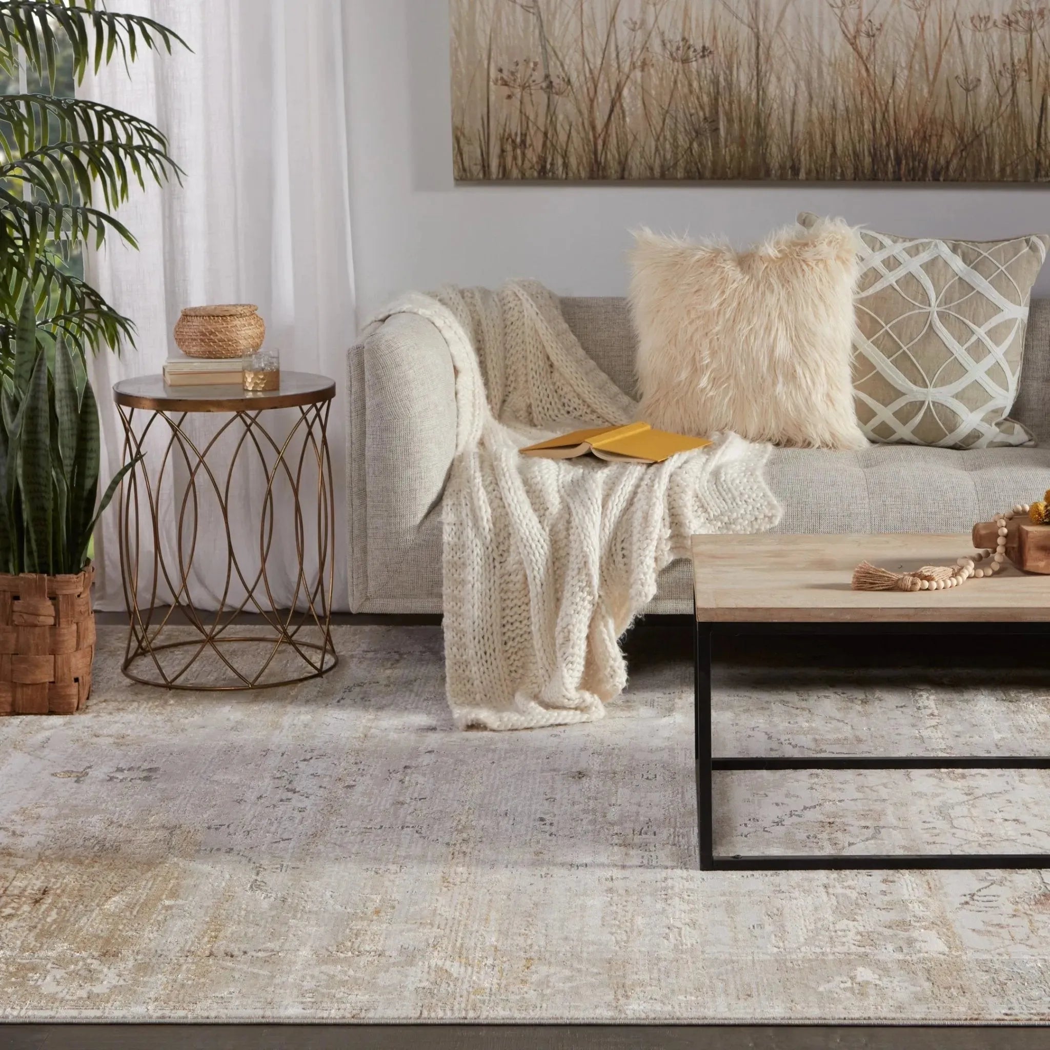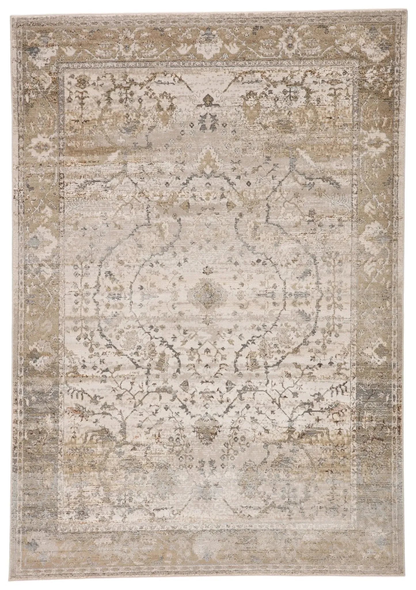 The Sinclaire collection is a vintage-inspired assortment of faded traditional designs for a casual yet glam statement. The Tajsa rug boasts an ornate center medallion with lustrous metallic details and a cream, gray, silver, and gold colorway. The sleek polyester and polypropylene fibers of this luxe rug lend a chameleon-like shine, offering the unique blend of modernity and timeless distressing.