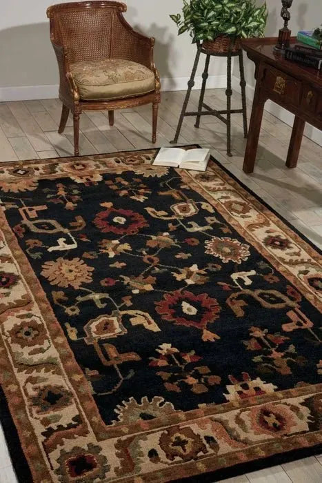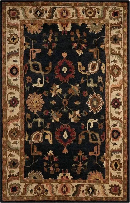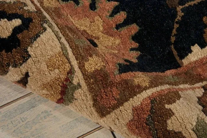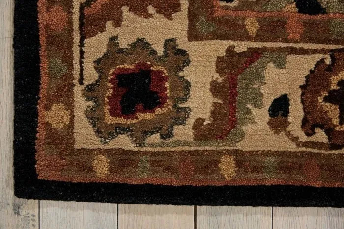 Nourison's Tahoe collection features distinctive, geometric tribal designs in a range of alluring earth tones. Hand-knotted in India of 100% hand-spun and enhanced with a special wash to create a beautiful, subtle patina that will warm up any space. Custom sizes available. This rug is perfect for your living room, dining room, den, bedroom, or any living space.