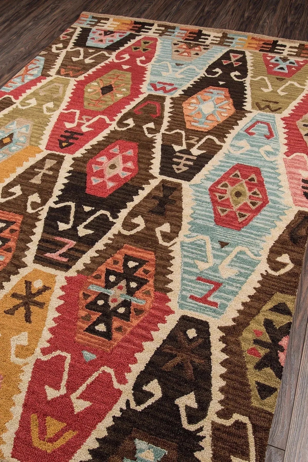 Rustic outdoor lifestyle meets the nomadic motifs of traditional Kazak patterns in the Tangier Collection by Momeni. Hand-hooked in India of 100% wool, tip sheared and then washed to create a worn rugged feeling. This rug is perfect for your living room, dining room, den, bedroom, or any living space.