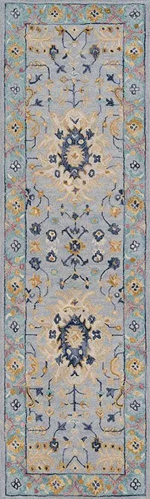 The Parisa PSA06 Denim/Multi Rug comes in various sizes, including 2x10, 5x7, 8x10, 8x11, 9x13, and 12x15 feet, accommodating different room dimensions.