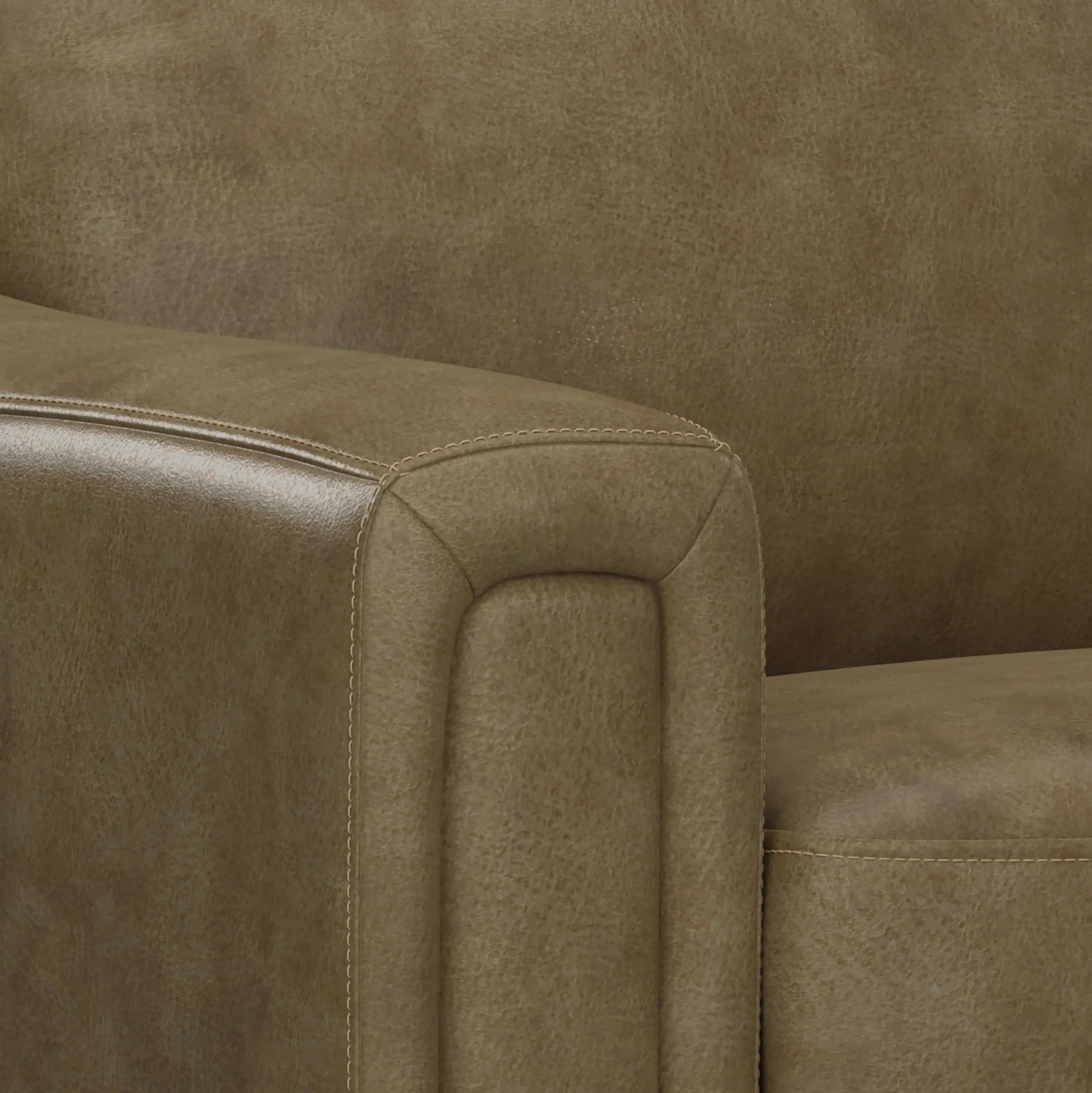 Teagan will change your opinion on motion furniture with its trimmed lines, fashionable fabrics, and thoughtful features. Each piece is designed with a contemporary frame and elevated on sleek metal sleigh legs for a modern touch. The sofa goes a step further with a built-in drop-down table featuring stainless steel cupholders and a storage drawer to combine style with practicality. Dual power functionality allows each person to separately adjust the head and foot rests to their optimum comfort. Beige and cream-flecked fabric upholsters the sofa and loveseat while coordinating recliners in a muted brown leather with pvc match or patterned fabric will make you want to put Teagan front and center.
