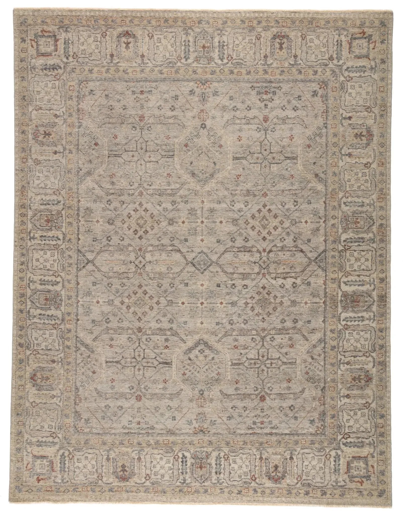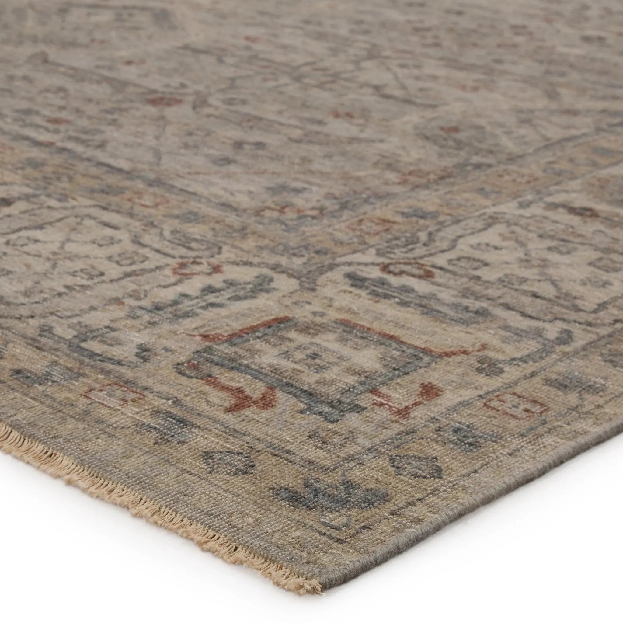 The vintage-inspired Tierzah collection features an antiqued wash and intricate traditional designs. The Maison wool rug boasts a Persian knot construction and neutral beige, taupe, and gray palette with rich hints of terracotta. This artisan-made rug features fringe trimmed details for a touch of global charm.
